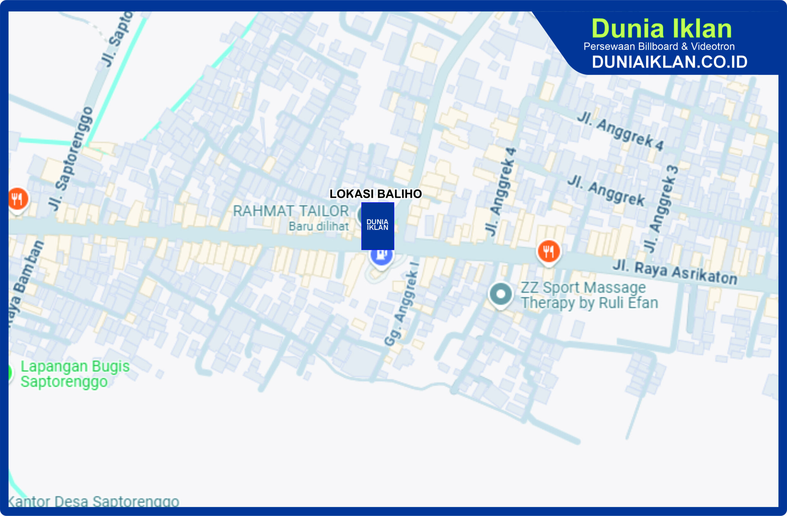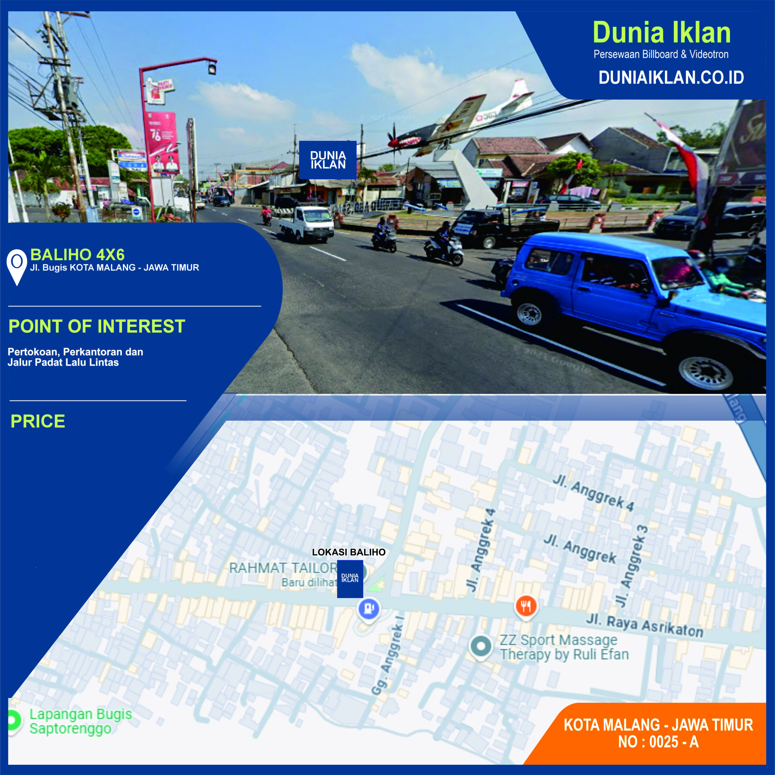 PT. Dunia Iklan Indonesia Jakarta menjadikan partner terbaik anda dalam menemukan kemudahan beriklan di ruang terbuka publik. Kami mempersembahkan ribuan titik-titik media iklan terbaik luar ruang berupa BALIHO, BILLBOARD ataupun VIDEOTRON di seluruh wilayah Indonesia dengan memberikan pilihan yang luas dan mudah diakses sesuai dengan target kebutuhan anda seperti titik Baliho Ukuran 4 x 6 M Horizontal Jl. Asrikaton (Bugis) Malang Jawa Timur ini.