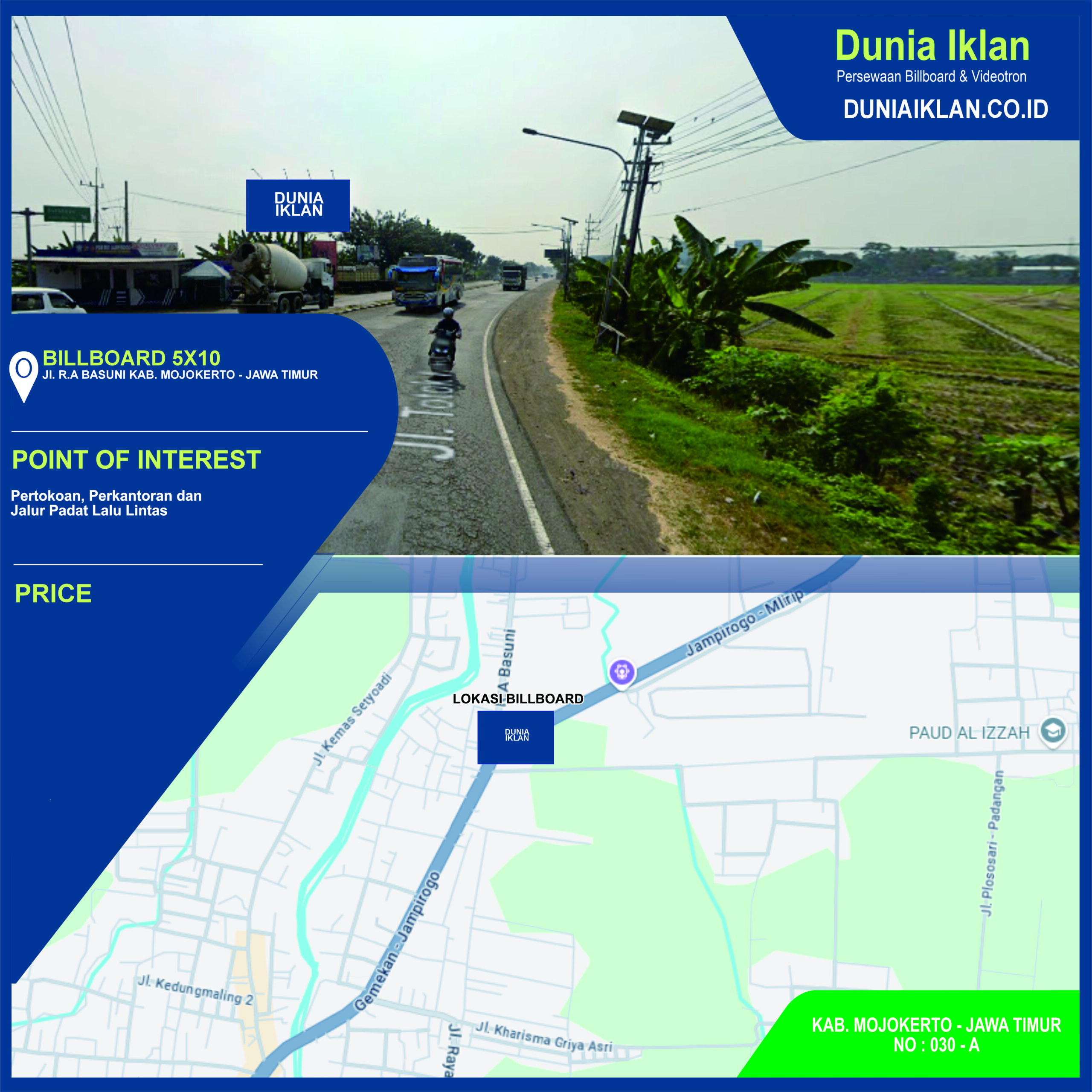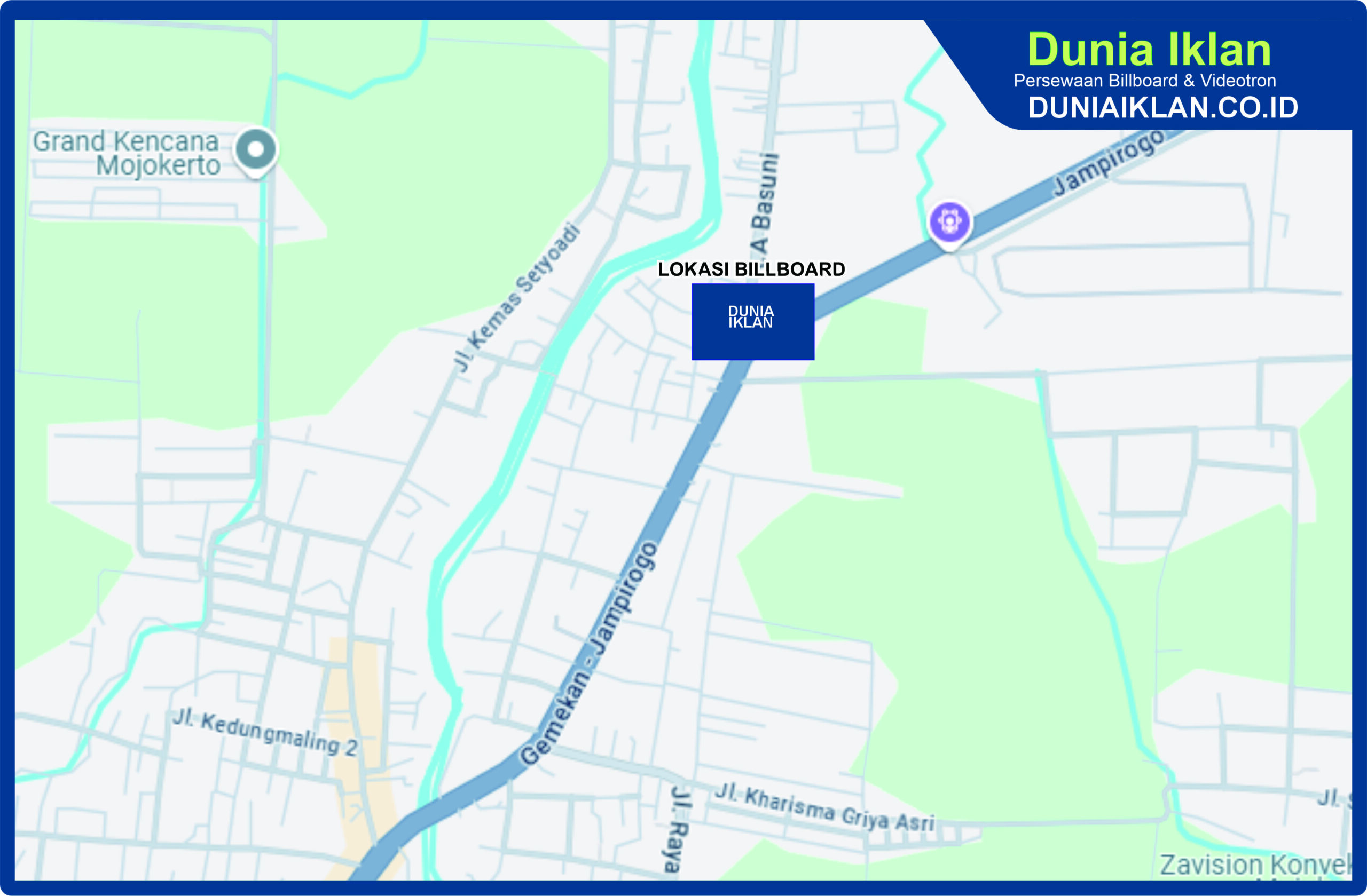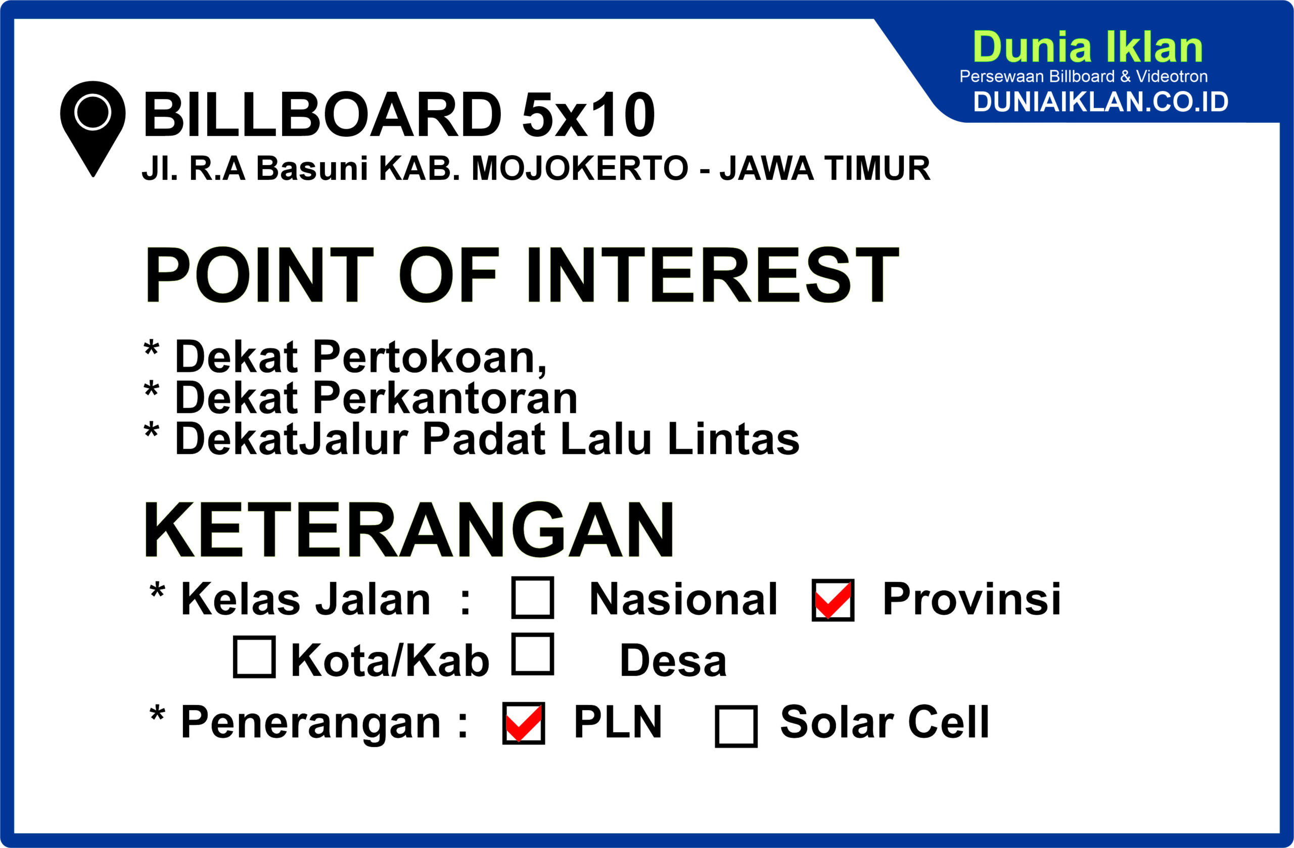 PT. Dunia Iklan Indonesia Jakarta menjadikan partner terbaik anda dalam menemukan kemudahan beriklan di ruang terbuka publik. Kami mempersembahkan ribuan titik-titik media iklan terbaik luar ruang berupa BALIHO, BILLBOARD ataupun VIDEOTRON di seluruh wilayah Indonesia dengan memberikan pilihan yang luas dan mudah diakses sesuai dengan target kebutuhan anda seperti titikĀ Billboard Ukuran 5 x 10 M Horizontal Jl. R.A Basuni Mojokerto Jawa Timur ini.