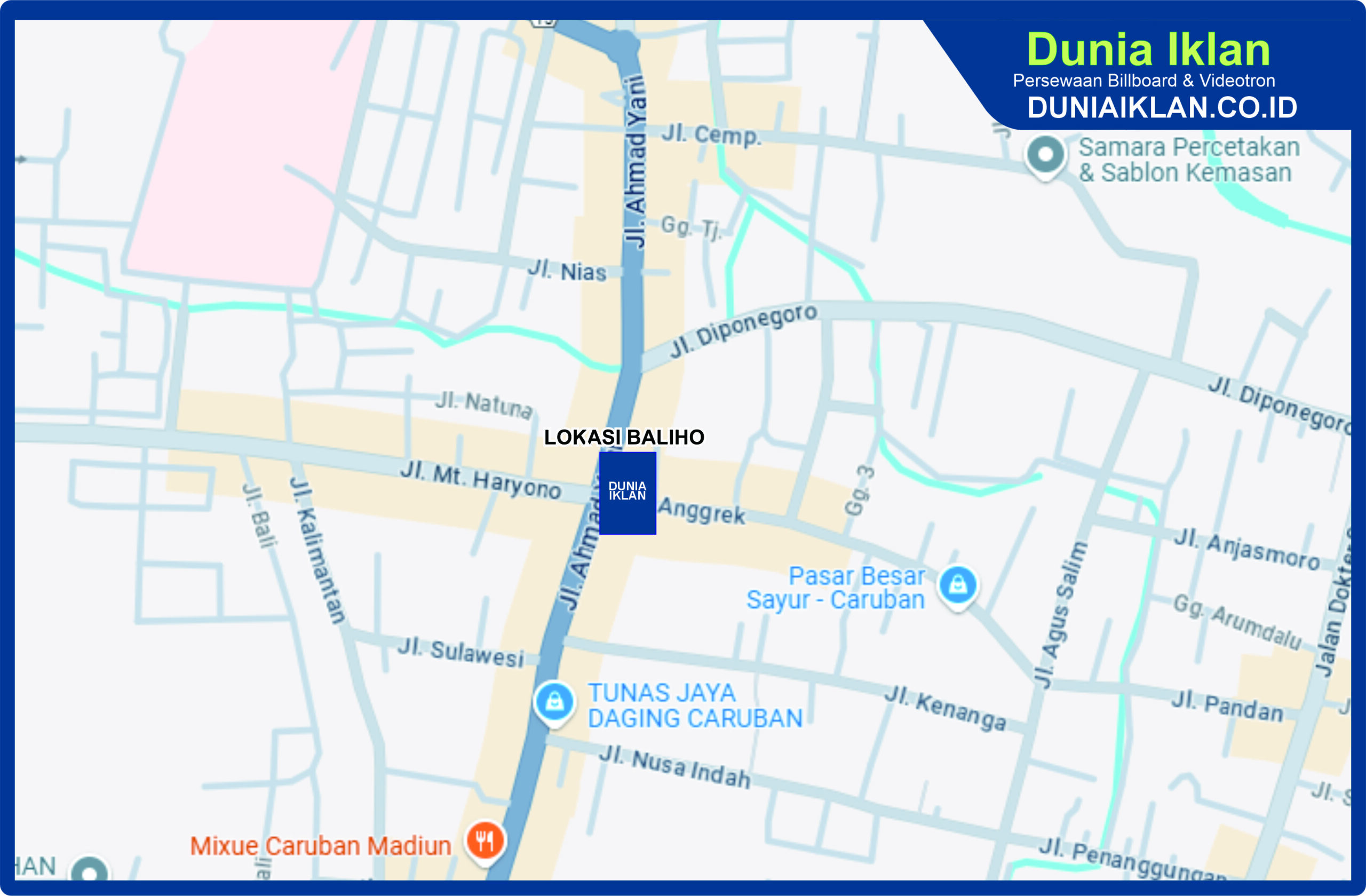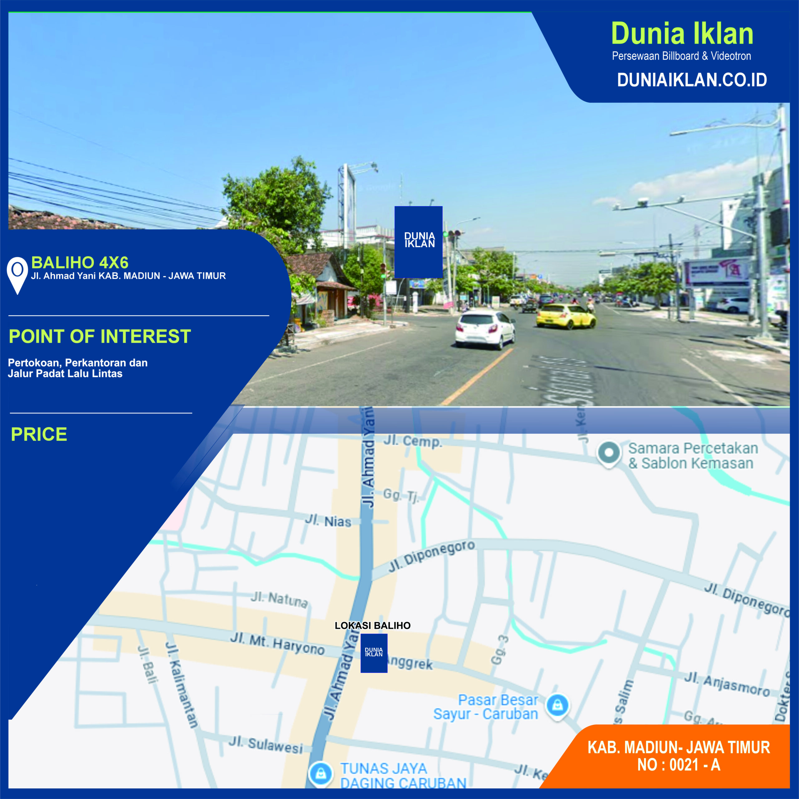 PT. Dunia Iklan Indonesia Jakarta menjadikan partner terbaik anda dalam menemukan kemudahan beriklan di ruang terbuka publik. Kami mempersembahkan ribuan titik-titik media iklan terbaik luar ruang berupa BALIHO, BILLBOARD ataupun VIDEOTRON di seluruh wilayah Indonesia dengan memberikan pilihan yang luas dan mudah diakses sesuai dengan target kebutuhan anda seperti titik Baliho ukuran 4 x 6 M Vertikal Jl. Ahmad Yani No. 71 Krajan Madiun Jawa Timur ini.