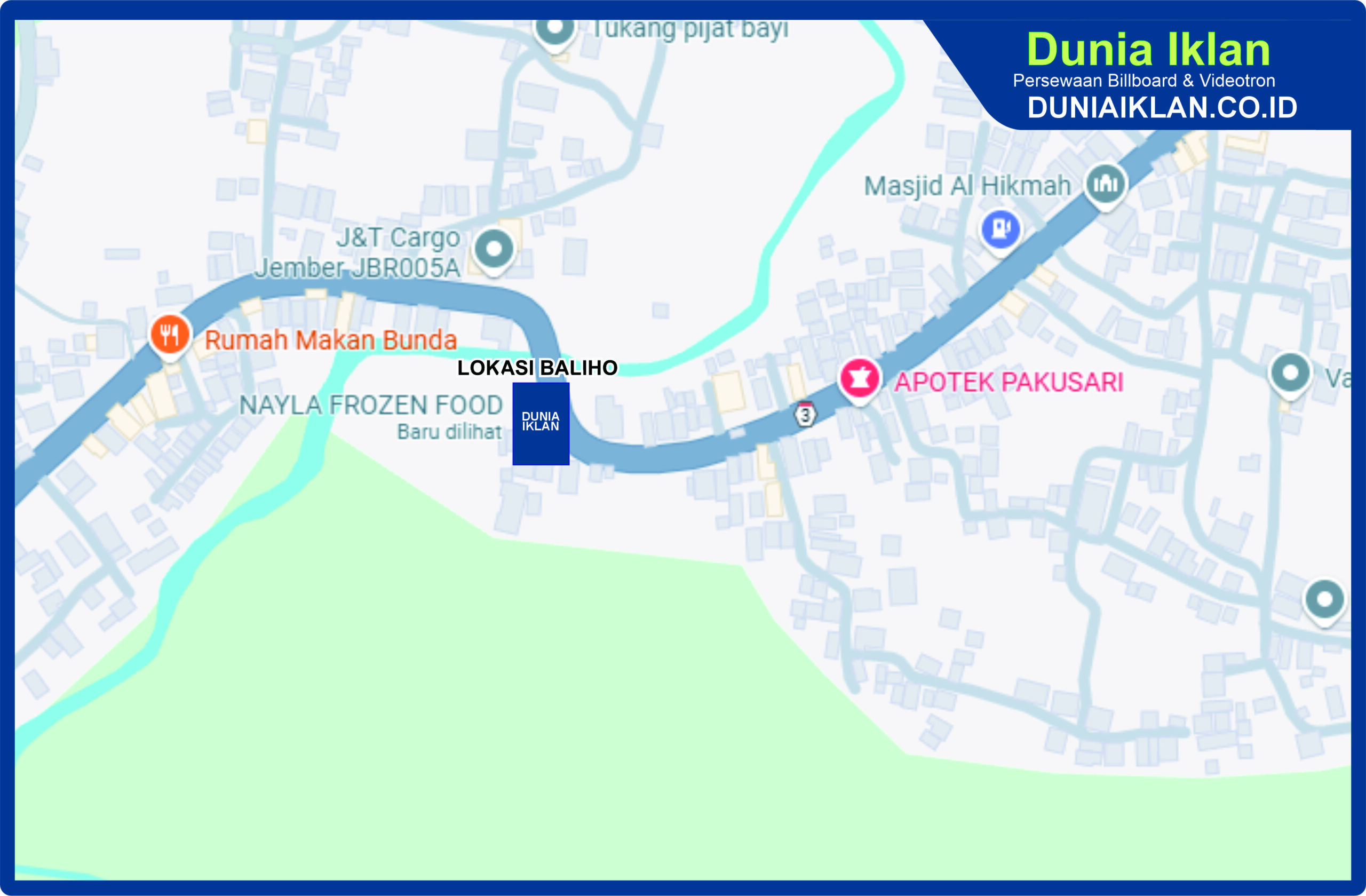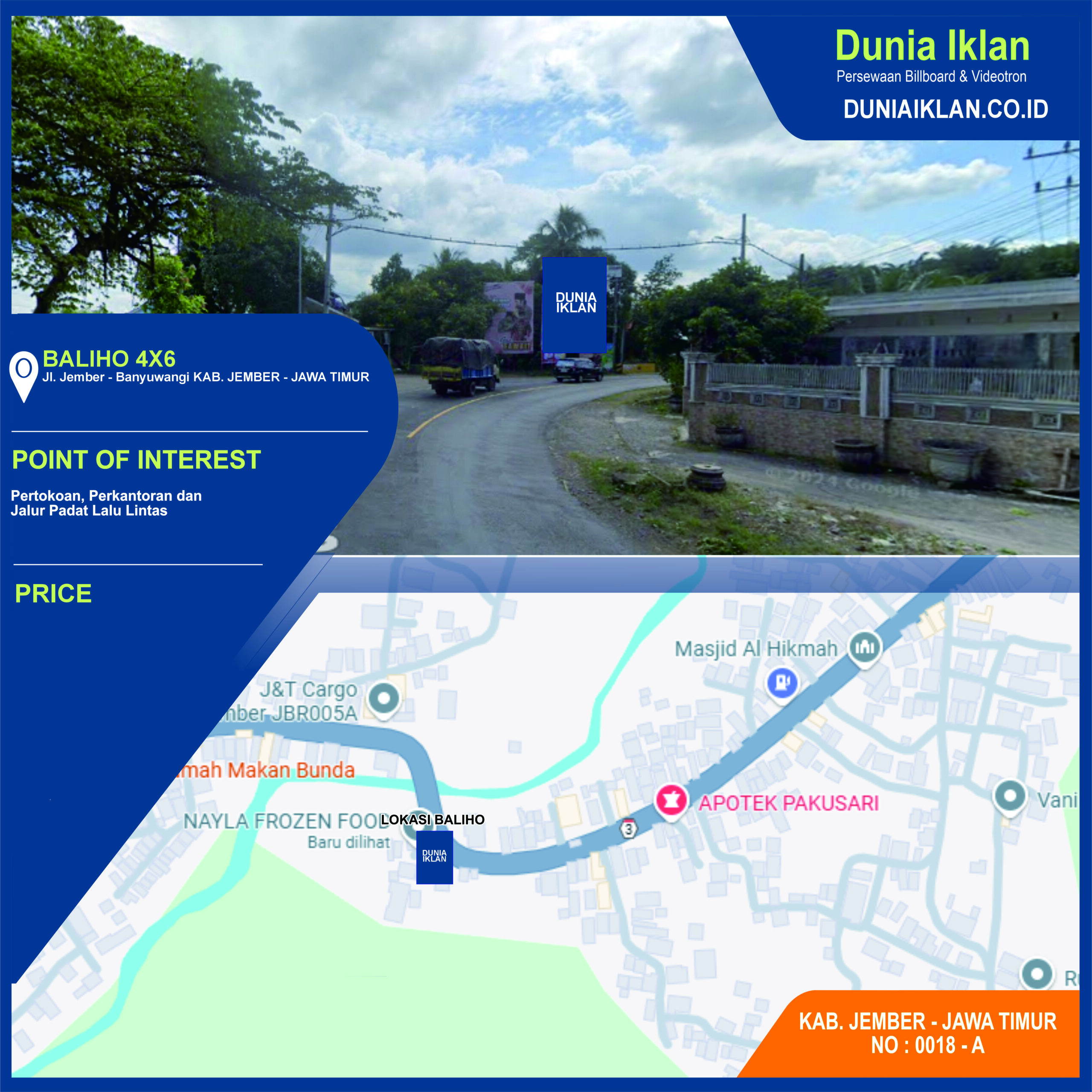 PT. Dunia Iklan Indonesia Jakarta menjadikan partner terbaik anda dalam menemukan kemudahan beriklan di ruang terbuka publik. Kami mempersembahkan ribuan titik-titik media iklan terbaik luar ruang berupa BALIHO, BILLBOARD ataupun VIDEOTRON di seluruh wilayah Indonesia dengan memberikan pilihan yang luas dan mudah diakses sesuai dengan target kebutuhan anda seperti titik Baliho Ukuran 4 x 6 M Vertikal Jl. Jember – Banyuwangi Jember Jawa Timur ini.