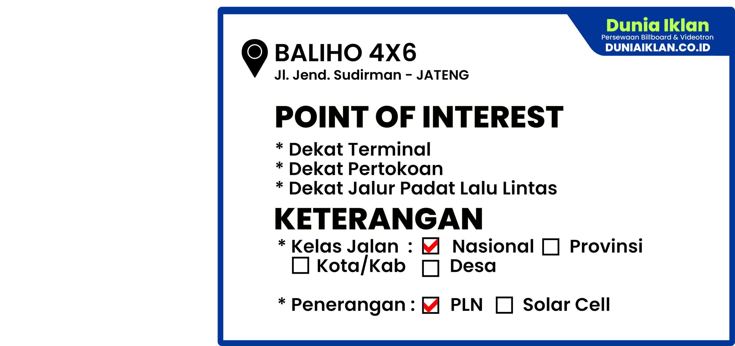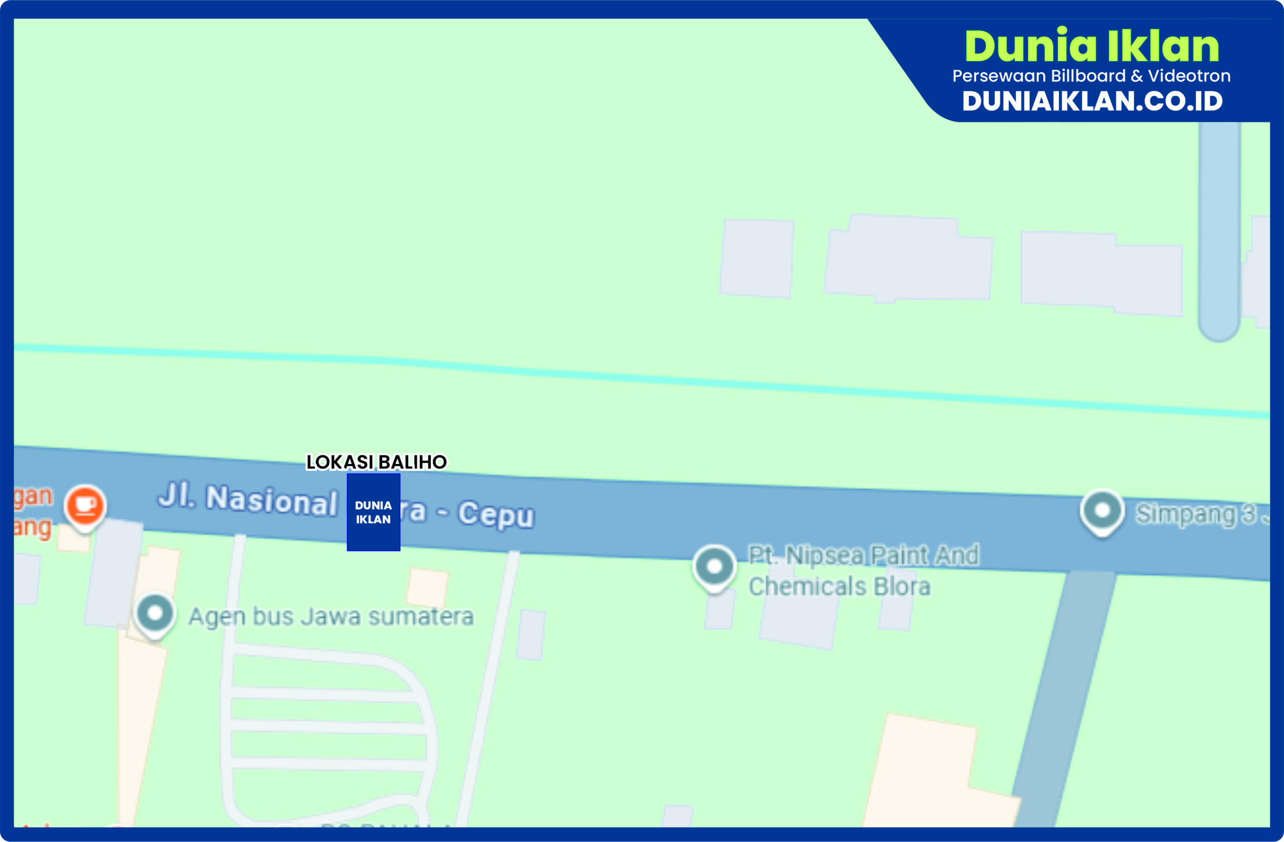 PT. Dunia Iklan Indonesia Jakarta menjadikan partner terbaik anda dalam menemukan kemudahan beriklan di ruang terbuka publik. Kami mempersembahkan ribuan titik-titik media iklan terbaik luar ruang berupa BALIHO, BILLBOARD ataupun VIDEOTRON di seluruh wilayah Indonesia dengan memberikan pilihan yang luas dan mudah diakses sesuai dengan target kebutuhan anda seperti titik Baliho Ukuran 4 x 6 M Vertikal Jl. Jend Sudirman Kab. Blora – Jawa Tengah ini.