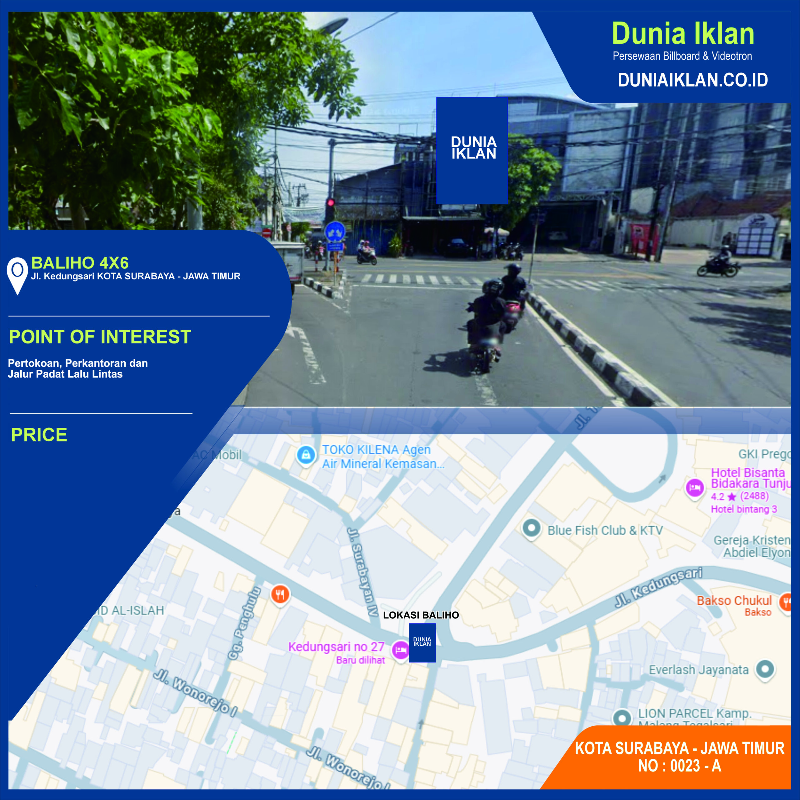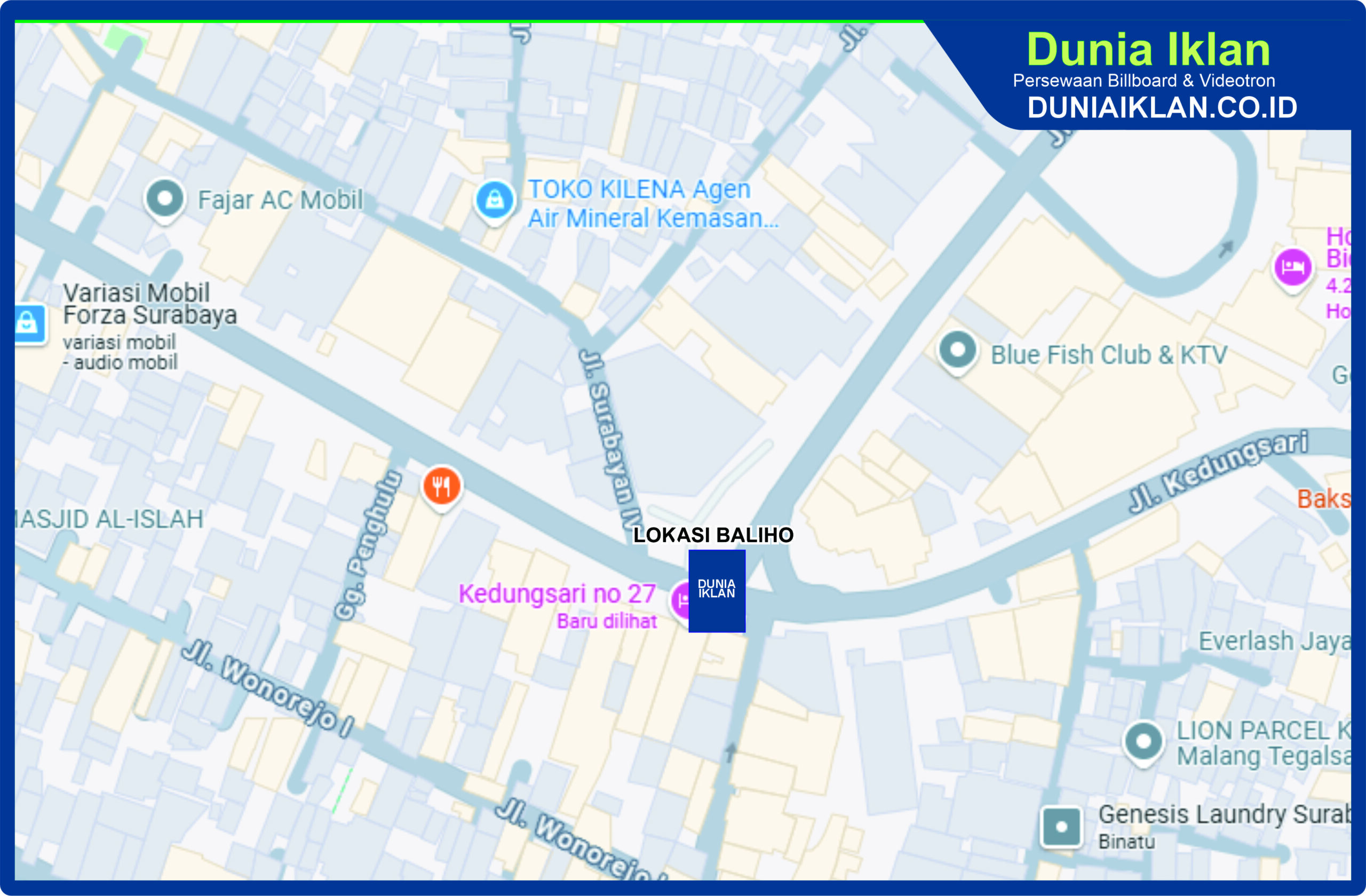 PT. Dunia Iklan Indonesia Jakarta menjadikan partner terbaik anda dalam menemukan kemudahan beriklan di ruang terbuka publik. Kami mempersembahkan ribuan titik-titik media iklan terbaik luar ruang berupa BALIHO, BILLBOARD ataupun VIDEOTRON di seluruh wilayah Indonesia dengan memberikan pilihan yang luas dan mudah diakses sesuai dengan target kebutuhan anda seperti titik Baliho ukuran 4 x 6 M Vertikal Jl. Kedungsari Wonorejo Surabaya Jawa Timur ini.