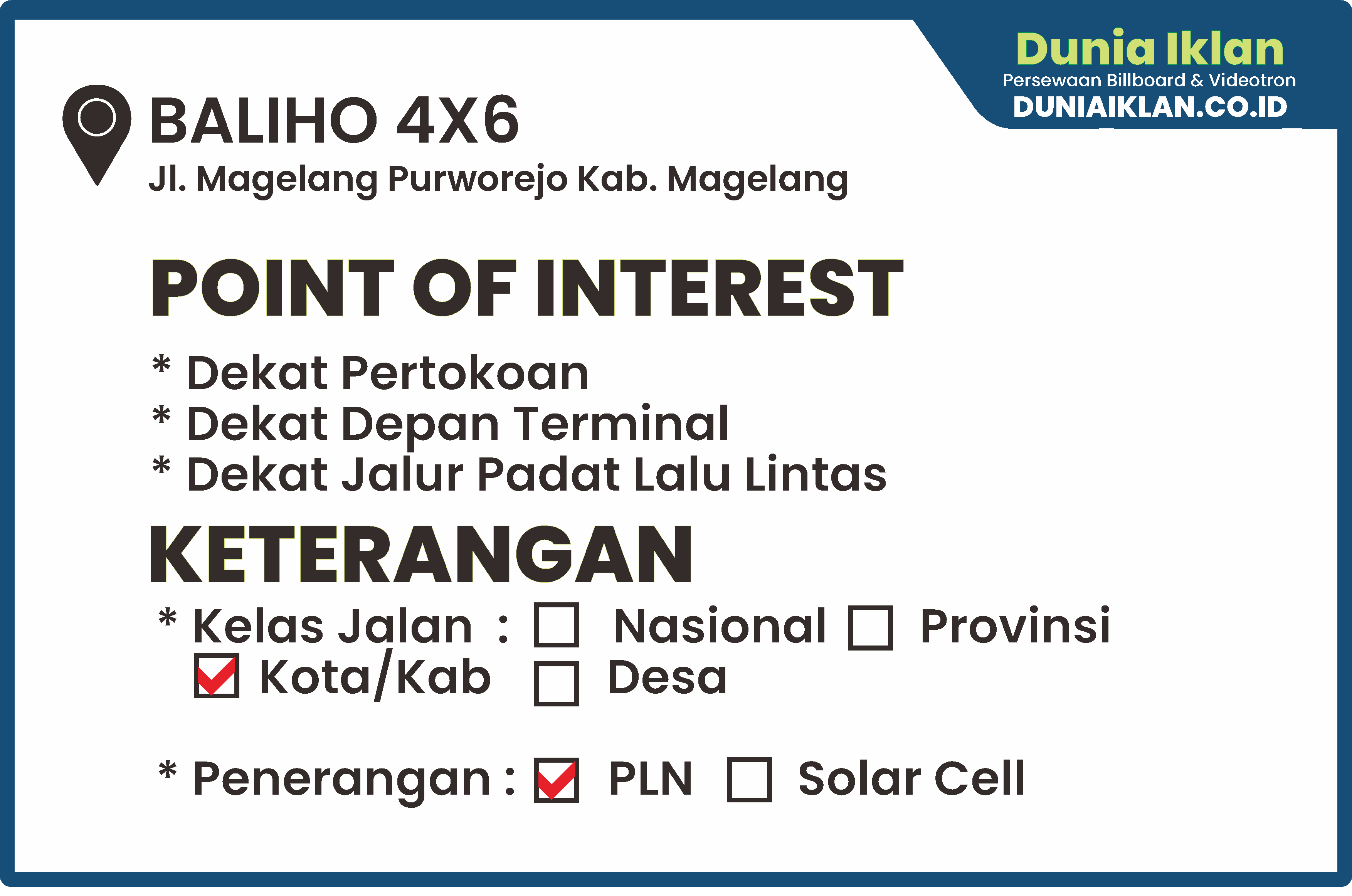 PT. Dunia Iklan Indonesia Jakarta menjadikan partner terbaik anda dalam menemukan kemudahan beriklan di ruang terbuka publik. Kami mempersembahkan ribuan titik-titik media iklan terbaik luar ruang berupa BALIHO, BILLBOARD ataupun VIDEOTRON di seluruh wilayah Indonesia dengan memberikan pilihan yang luas dan mudah diakses sesuai dengan target kebutuhan anda seperti titik Baliho Ukuran 4 x 6 M Vertikal Jl. Magelang-Purworejo Kab. Magelang – Jawa Tengah ini.