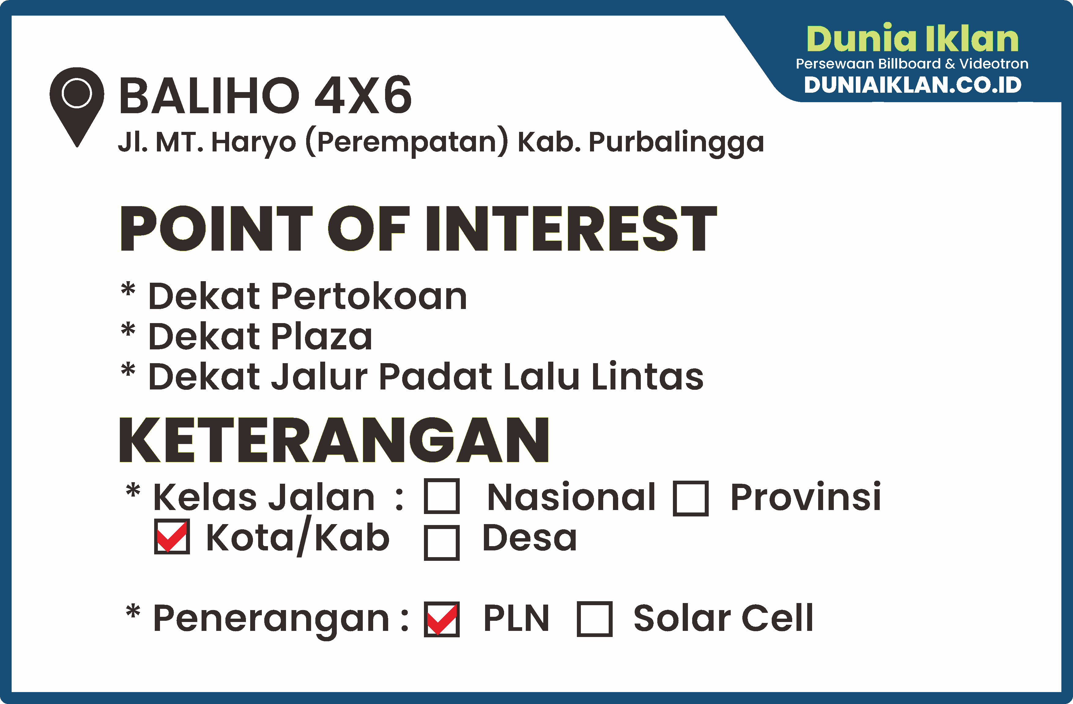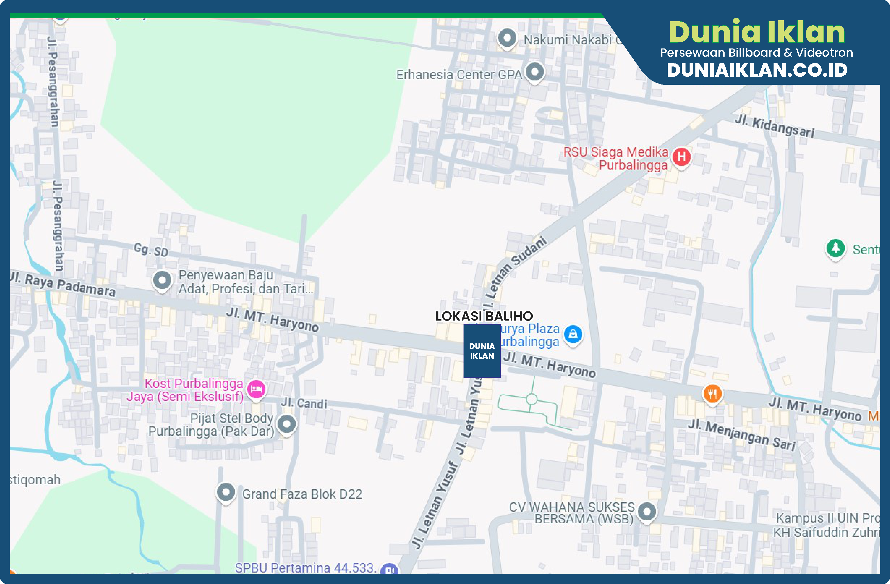 PT. Dunia Iklan Indonesia Jakarta menjadikan partner terbaik anda dalam menemukan kemudahan beriklan di ruang terbuka publik. Kami mempersembahkan ribuan titik-titik media iklan terbaik luar ruang berupa BALIHO, BILLBOARD ataupun VIDEOTRON di seluruh wilayah Indonesia dengan memberikan pilihan yang luas dan mudah diakses sesuai dengan target kebutuhan anda seperti titik Baliho Ukuran 4 x 6 M Vertikal Jl. MT. Haryono Kab. Purbalingga – Jawa Tengah ini.