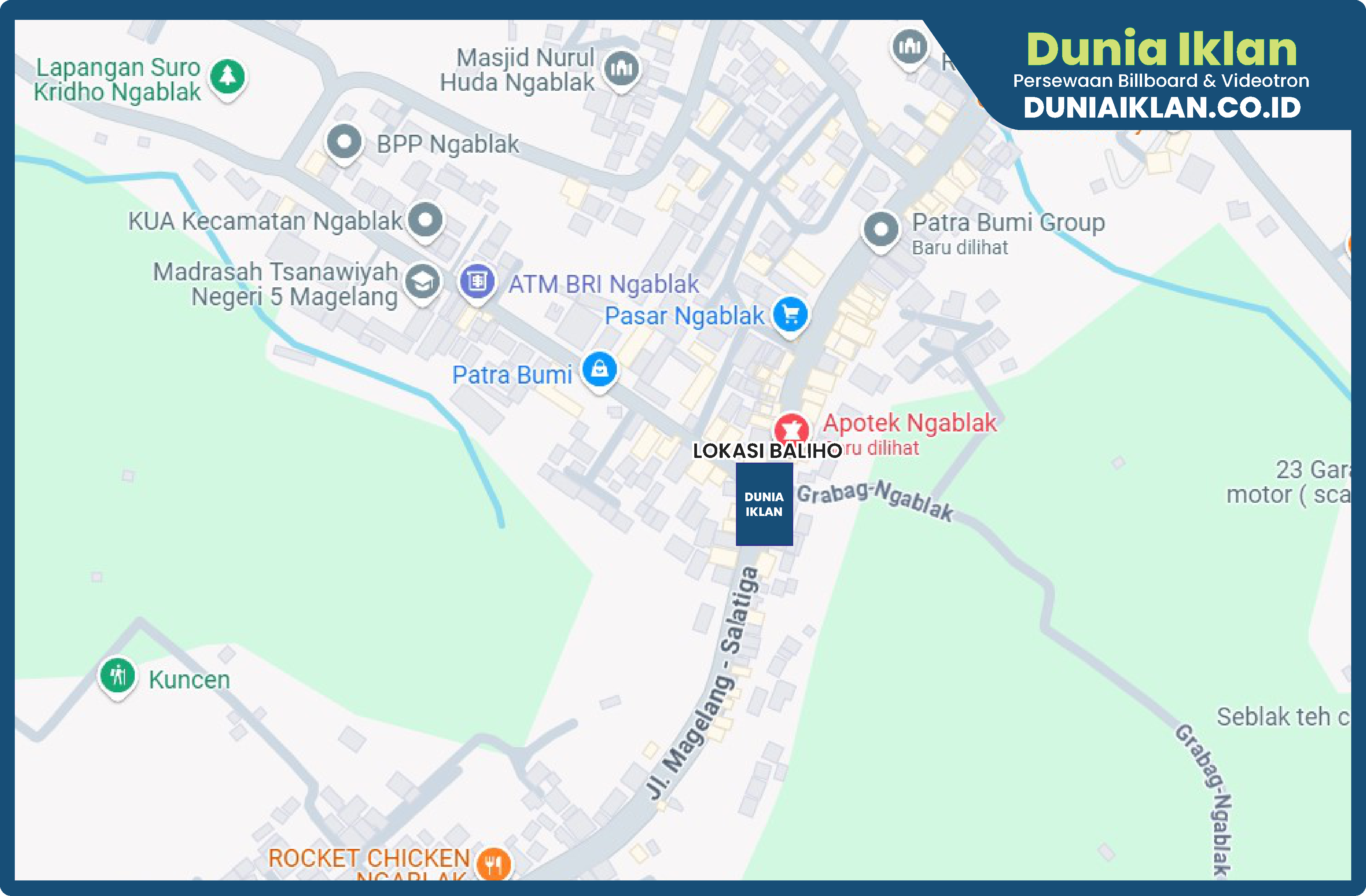 PT. Dunia Iklan Indonesia Jakarta menjadikan partner terbaik anda dalam menemukan kemudahan beriklan di ruang terbuka publik. Kami mempersembahkan ribuan titik-titik media iklan terbaik luar ruang berupa BALIHO, BILLBOARD ataupun VIDEOTRON di seluruh wilayah Indonesia dengan memberikan pilihan yang luas dan mudah diakses sesuai dengan target kebutuhan anda seperti titik Baliho Ukuran 4 x 6 M Vertikal Jl. Ngablak Kab. Magelang – Jawa Tengah ini.