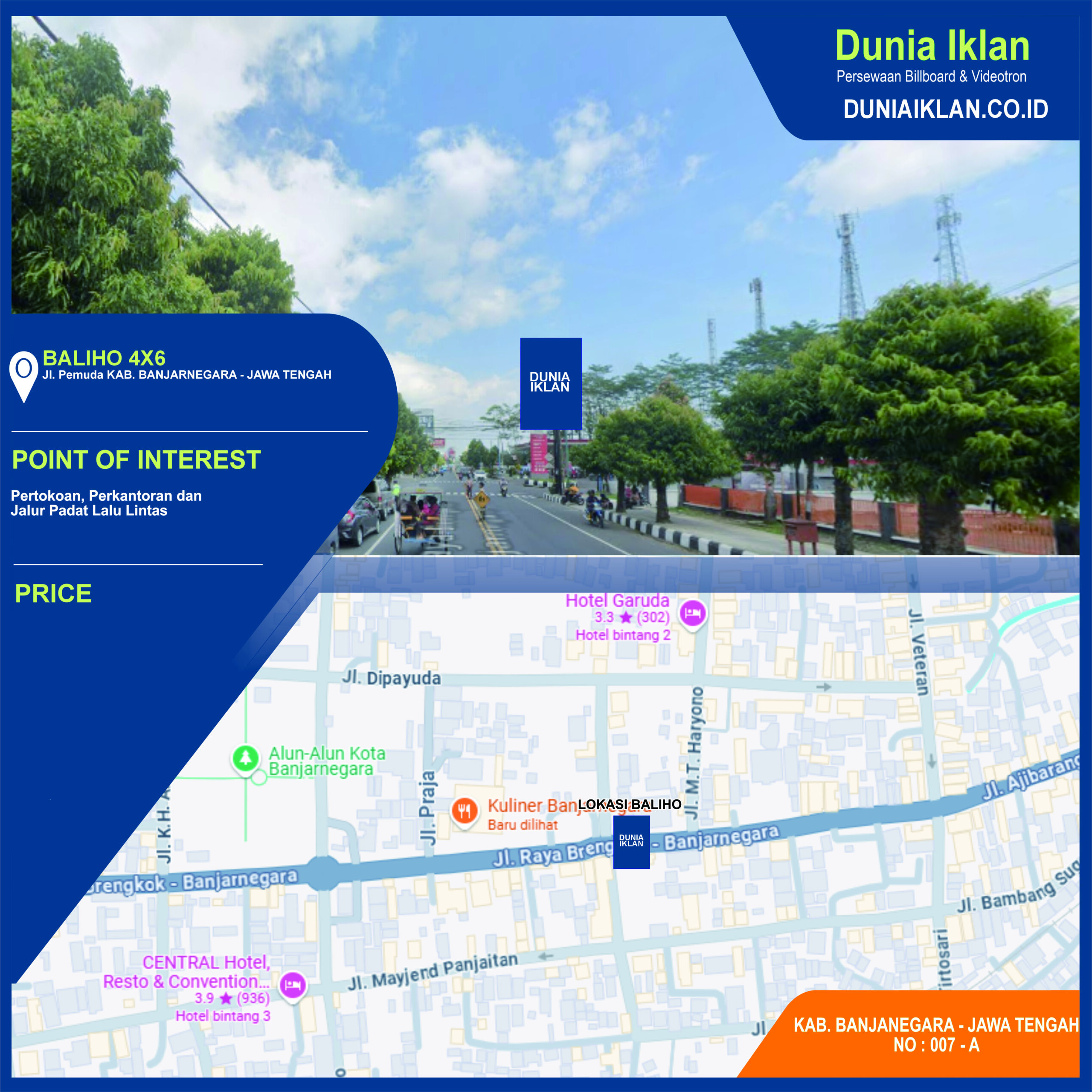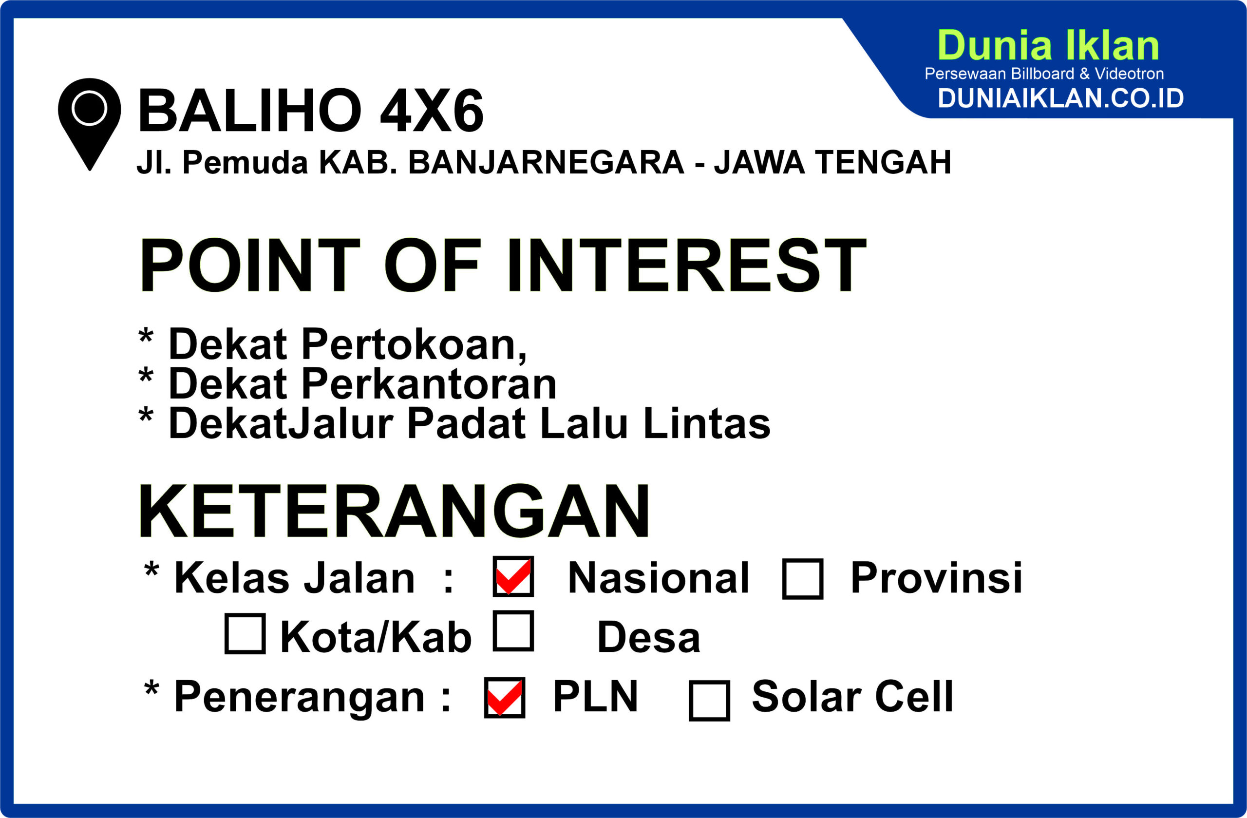 PT. Dunia Iklan Indonesia Jakarta menjadikan partner terbaik anda dalam menemukan kemudahan beriklan di ruang terbuka publik. Kami mempersembahkan ribuan titik-titik media iklan terbaik luar ruang berupa BALIHO, BILLBOARD ataupun VIDEOTRON di seluruh wilayah Indonesia dengan memberikan pilihan yang luas dan mudah diakses sesuai dengan target kebutuhan anda seperti titik Baliho Ukuran 4 x 6 M Vertikal Jl. Pemuda Kab. Banjarnegara Jawa Tengah ini.