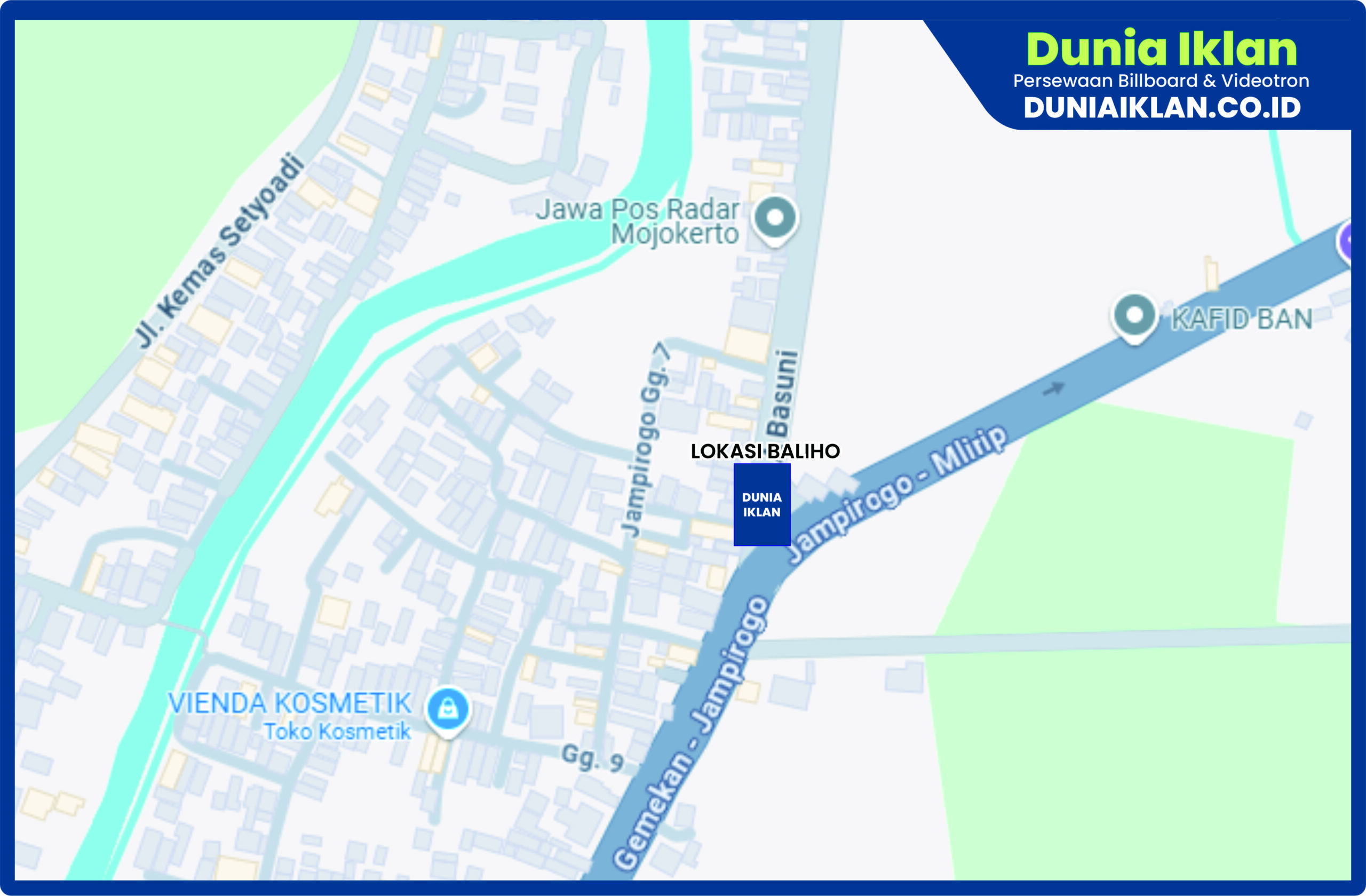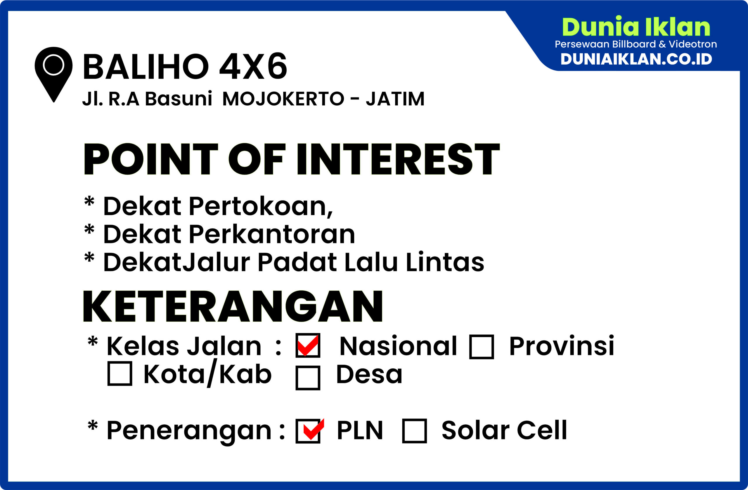 PT. Dunia Iklan Indonesia Jakarta menjadikan partner terbaik anda dalam menemukan kemudahan beriklan di ruang terbuka publik. Kami mempersembahkan ribuan titik-titik media iklan terbaik luar ruang berupa BALIHO, BILLBOARD ataupun VIDEOTRON di seluruh wilayah Indonesia dengan memberikan pilihan yang luas dan mudah diakses sesuai dengan target kebutuhan anda seperti titik Baliho Ukuran 4 x 6 M Vertikal Jl. R.A Basuni Mojokerto – Jawa Timur ini.