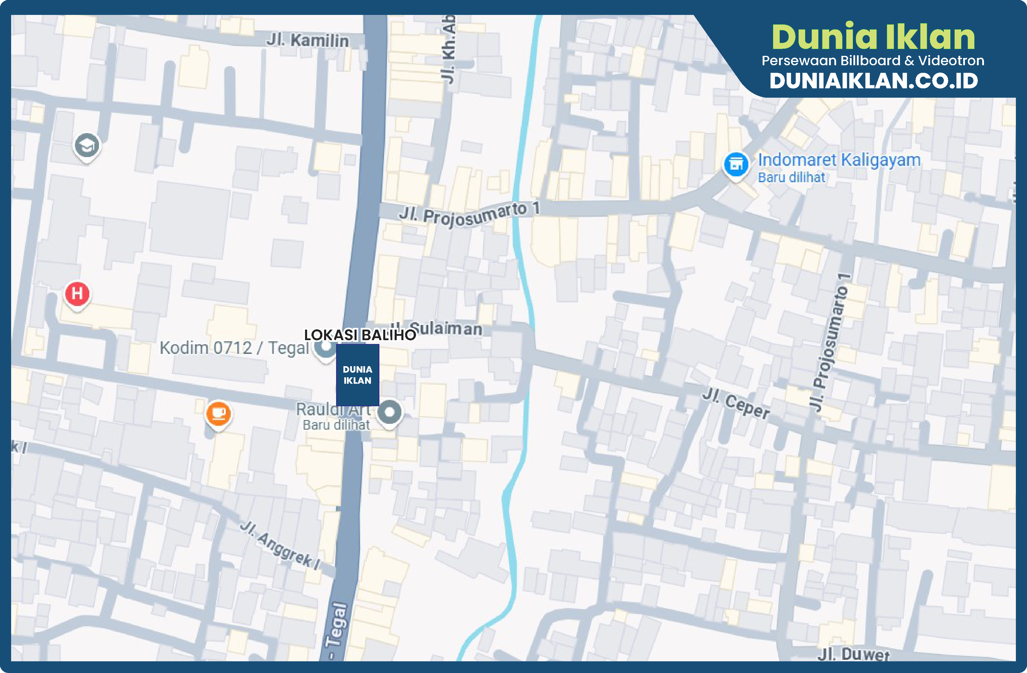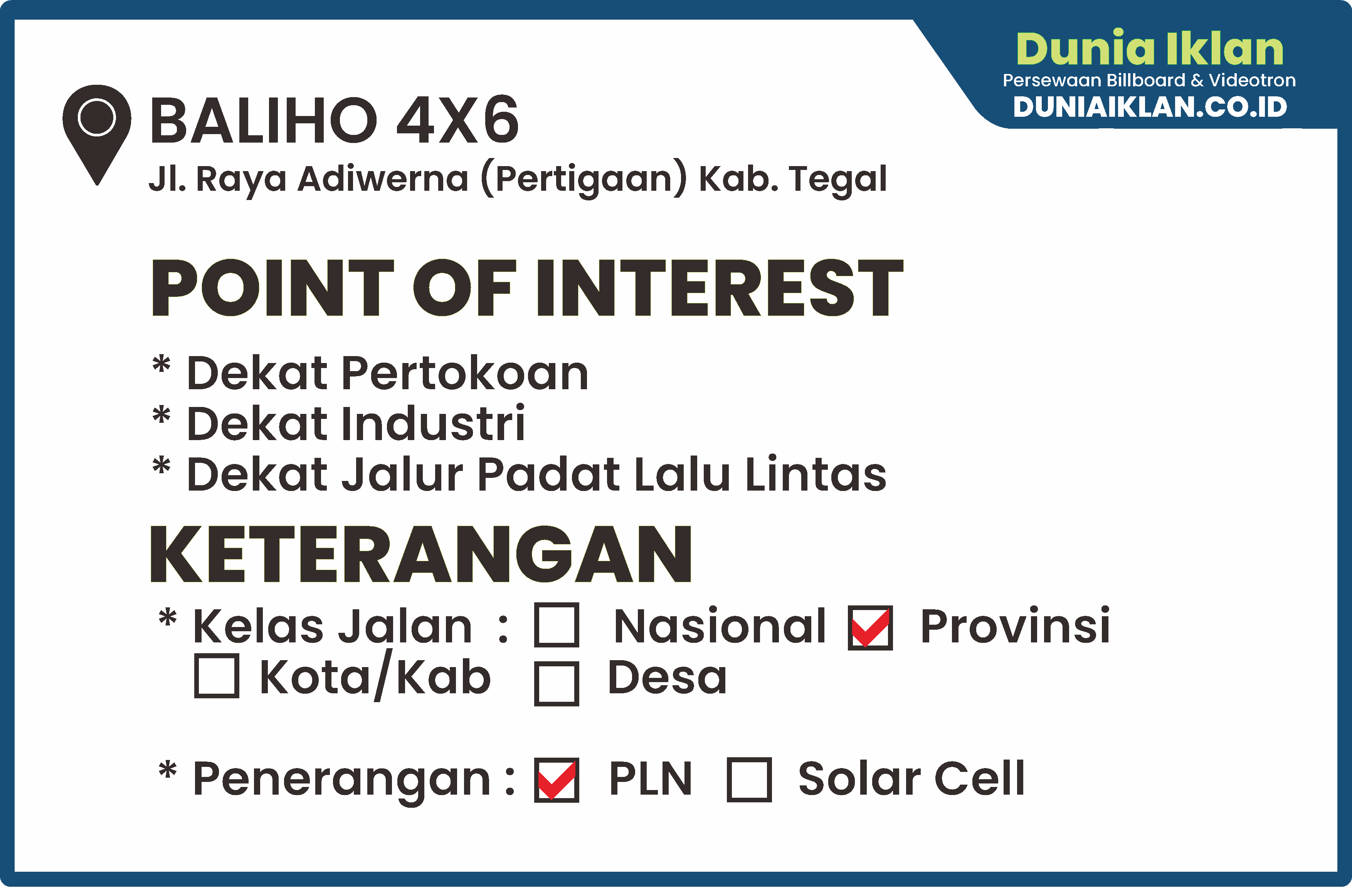 PT. Dunia Iklan Indonesia Jakarta menjadikan partner terbaik anda dalam menemukan kemudahan beriklan di ruang terbuka publik. Kami mempersembahkan ribuan titik-titik media iklan terbaik luar ruang berupa BALIHO, BILLBOARD ataupun VIDEOTRON di seluruh wilayah Indonesia dengan memberikan pilihan yang luas dan mudah diakses sesuai dengan target kebutuhan anda seperti titik Baliho Ukuran 4 x 6 M Vertikal Jl. Raya Adiwerna Kab. Tegal – Jawa Tengah ini.