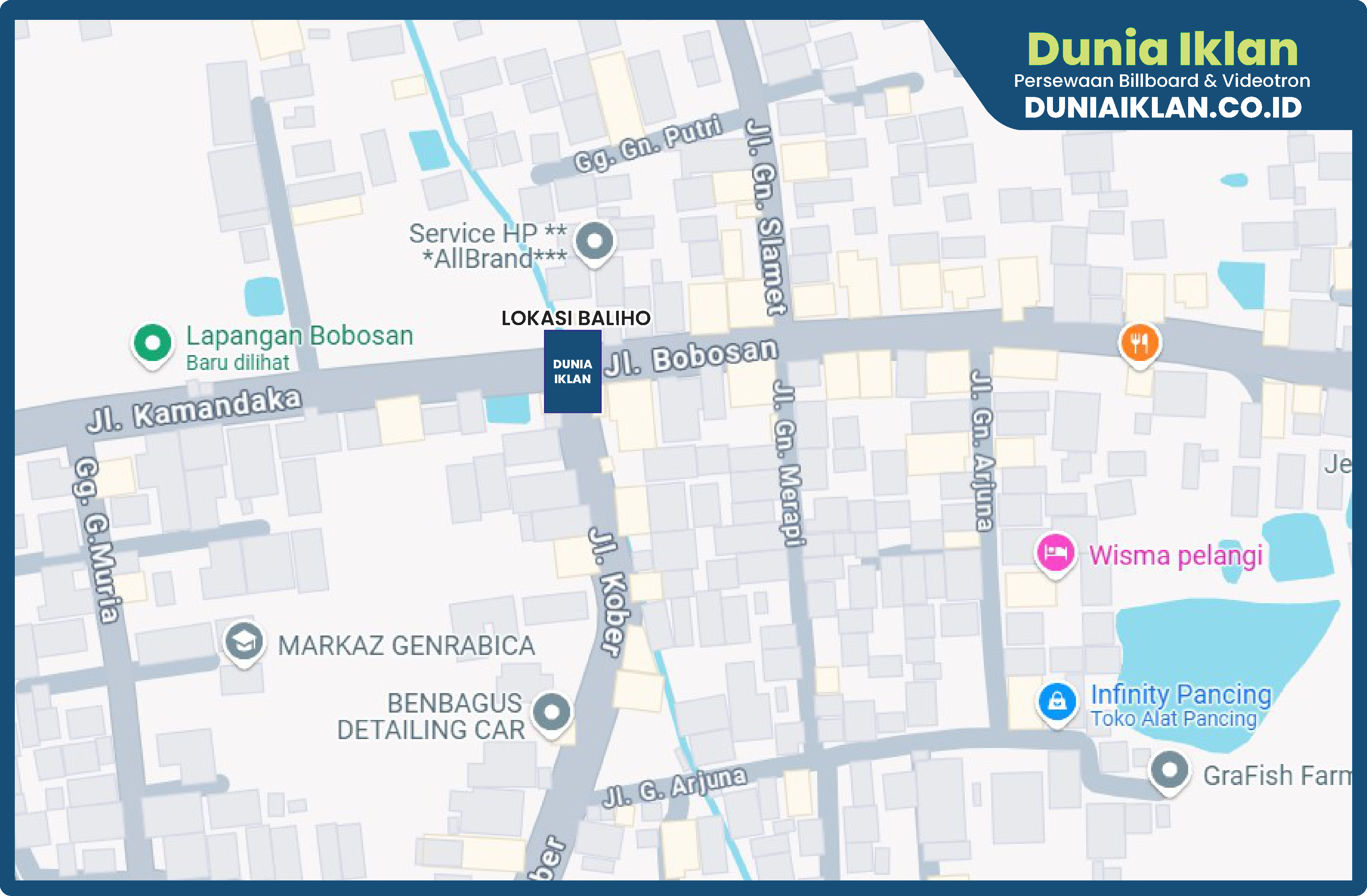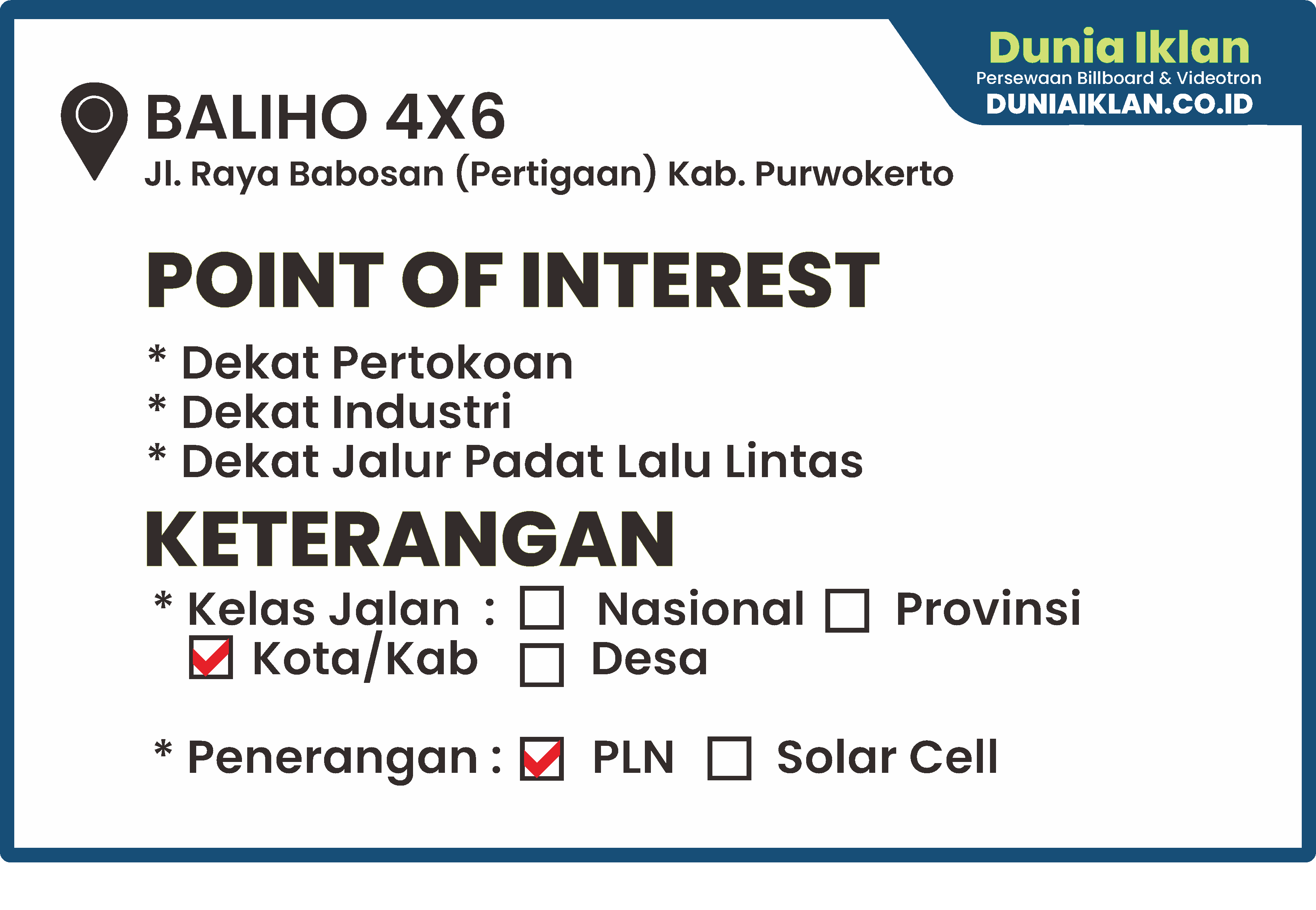 PT. Dunia Iklan Indonesia Jakarta menjadikan partner terbaik anda dalam menemukan kemudahan beriklan di ruang terbuka publik. Kami mempersembahkan ribuan titik-titik media iklan terbaik luar ruang berupa BALIHO, BILLBOARD ataupun VIDEOTRON di seluruh wilayah Indonesia dengan memberikan pilihan yang luas dan mudah diakses sesuai dengan target kebutuhan anda seperti titik Baliho Ukuran 4 x 6 M Vertikal Jl. Raya Babosan Kab. Purwokerto – Jawa Tengah ini.
