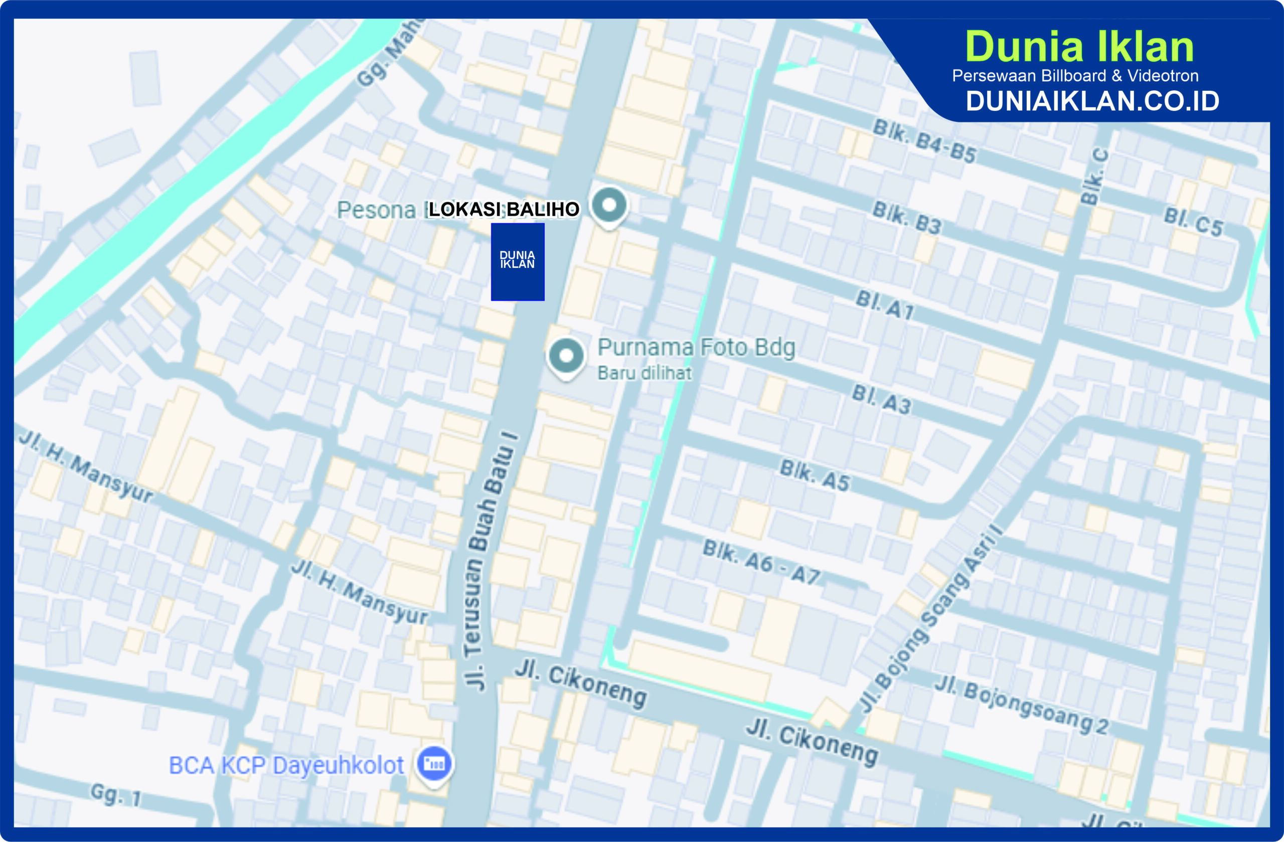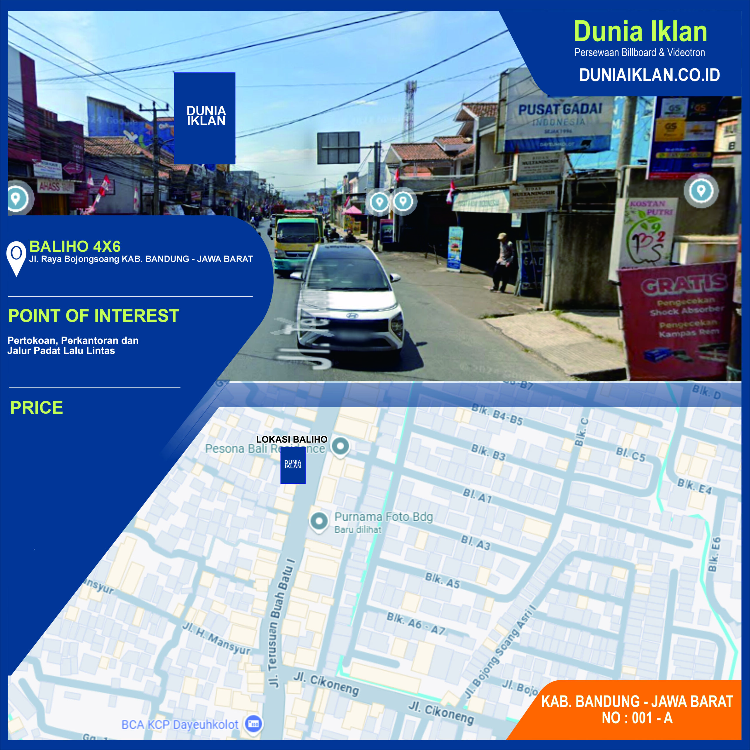 PT. Dunia Iklan Indonesia Jakarta menjadikan partner terbaik anda dalam menemukan kemudahan beriklan di ruang terbuka publik. Kami mempersembahkan ribuan titik-titik media iklan terbaik luar ruang berupa BALIHO, BILLBOARD ataupun VIDEOTRON di seluruh wilayah Indonesia dengan memberikan pilihan yang luas dan mudah diakses sesuai dengan target kebutuhan anda seperti titik Baliho Ukuran 4 x 6 M Vertikal Jl. Raya Bojongsoang Kab. Bandung – Jawa Barat ini.