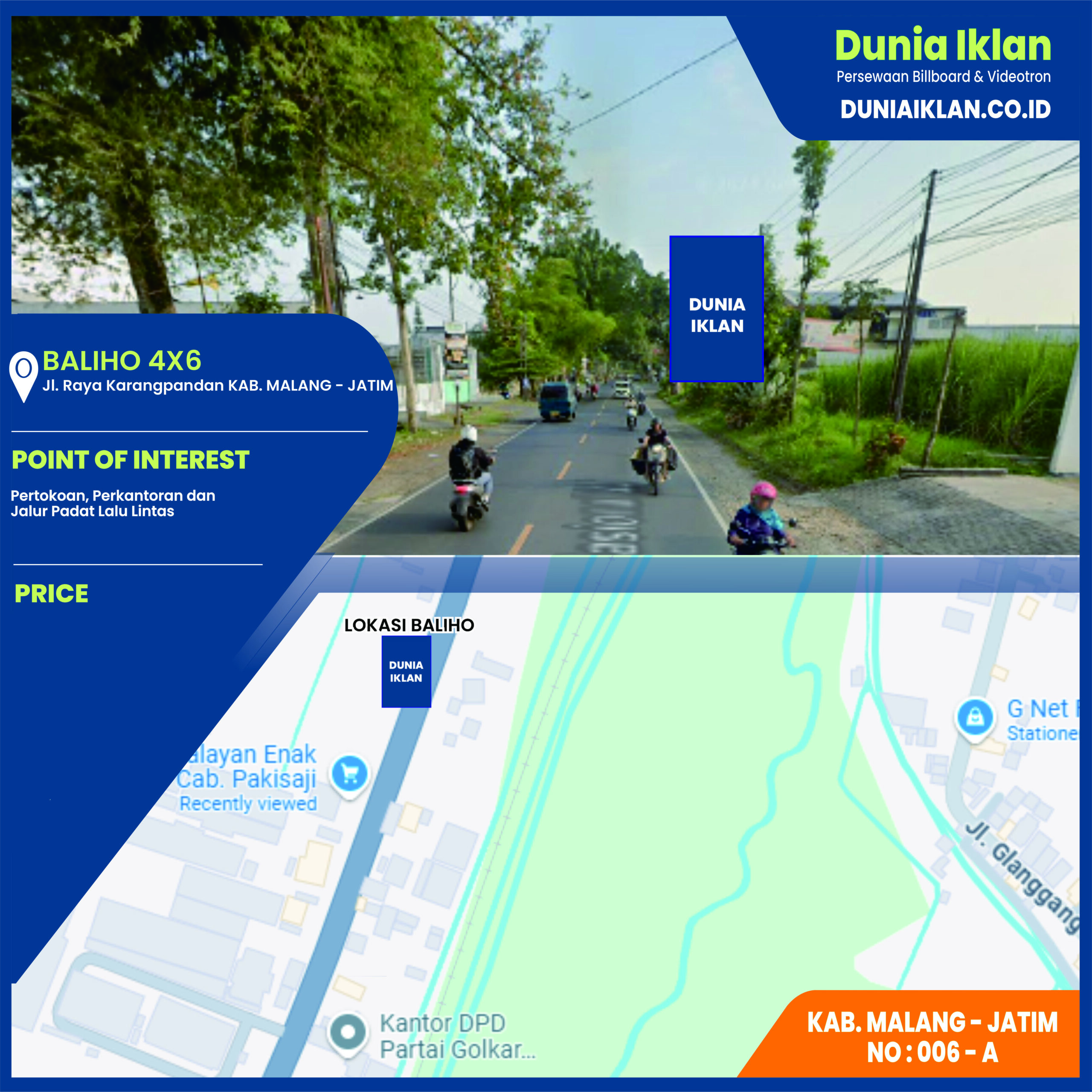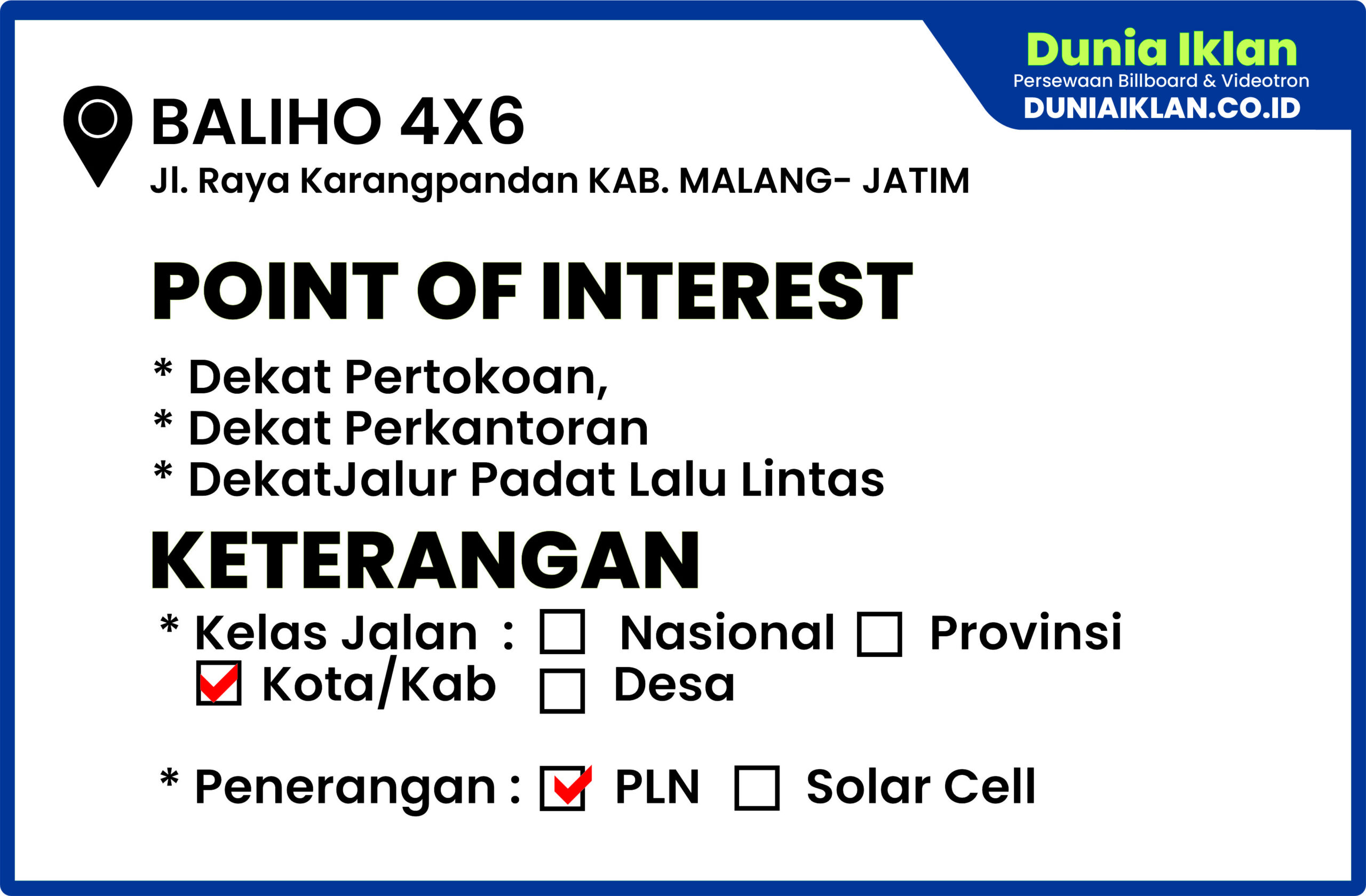 PT. Dunia Iklan Indonesia Jakarta menjadikan partner terbaik anda dalam menemukan kemudahan beriklan di ruang terbuka publik. Kami mempersembahkan ribuan titik-titik media iklan terbaik luar ruang berupa BALIHO, BILLBOARD ataupun VIDEOTRON di seluruh wilayah Indonesia dengan memberikan pilihan yang luas dan mudah diakses sesuai dengan target kebutuhan anda seperti titik Baliho Ukuran 4 x 6 M Vertikal Jl. Raya Karangpandan Kab. Malang – Jawa Timur ini.