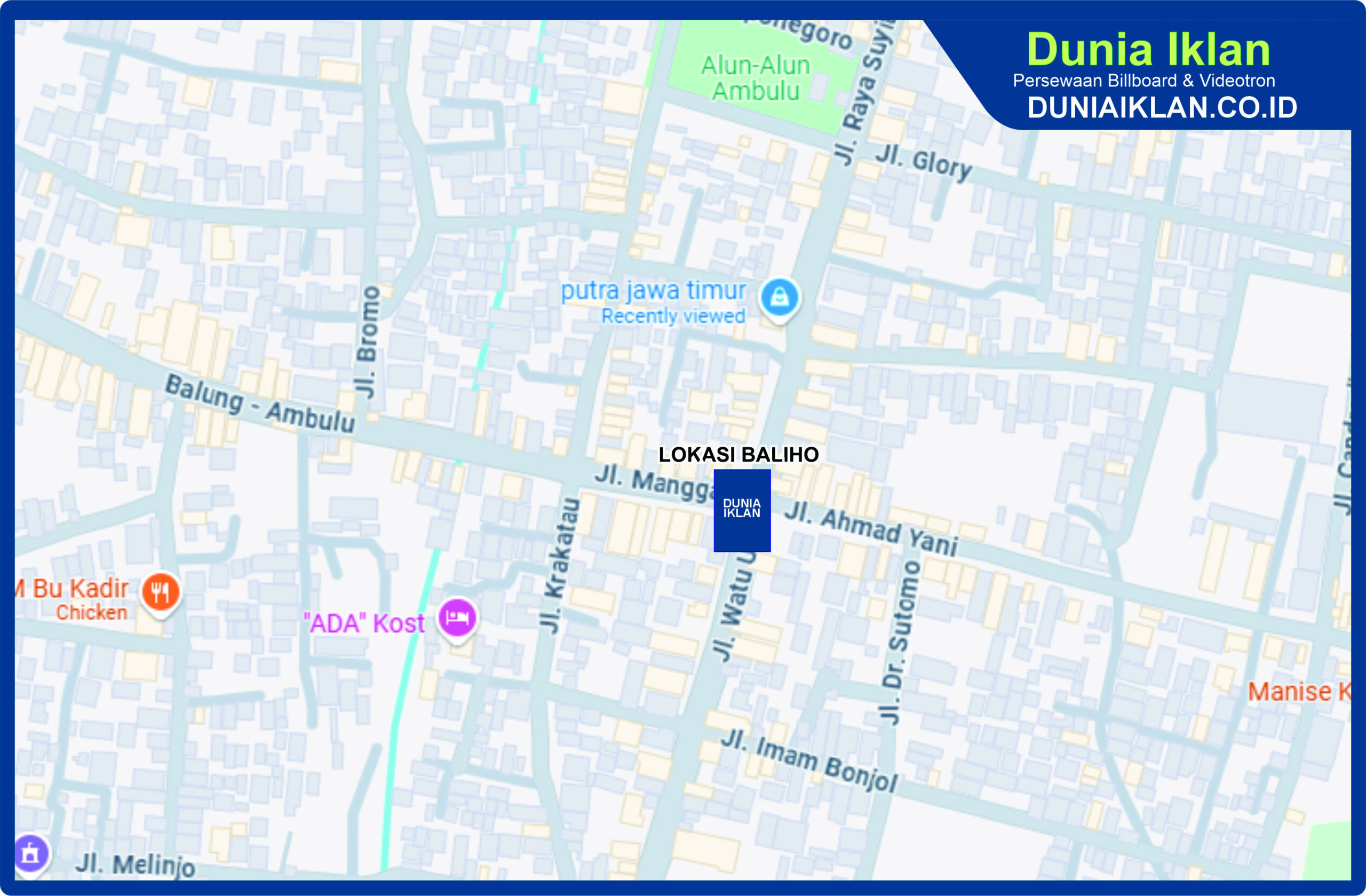 PT. Dunia Iklan Indonesia Jakarta menjadikan partner terbaik anda dalam menemukan kemudahan beriklan di ruang terbuka publik. Kami mempersembahkan ribuan titik-titik media iklan terbaik luar ruang berupa BALIHO, BILLBOARD ataupun VIDEOTRON di seluruh wilayah Indonesia dengan memberikan pilihan yang luas dan mudah diakses sesuai dengan target kebutuhan anda seperti titik Baliho Ukuran 4 x 6 M Vertikal Jl. Raya Suyitman (Ambulu) Jember Jawa Timur ini.