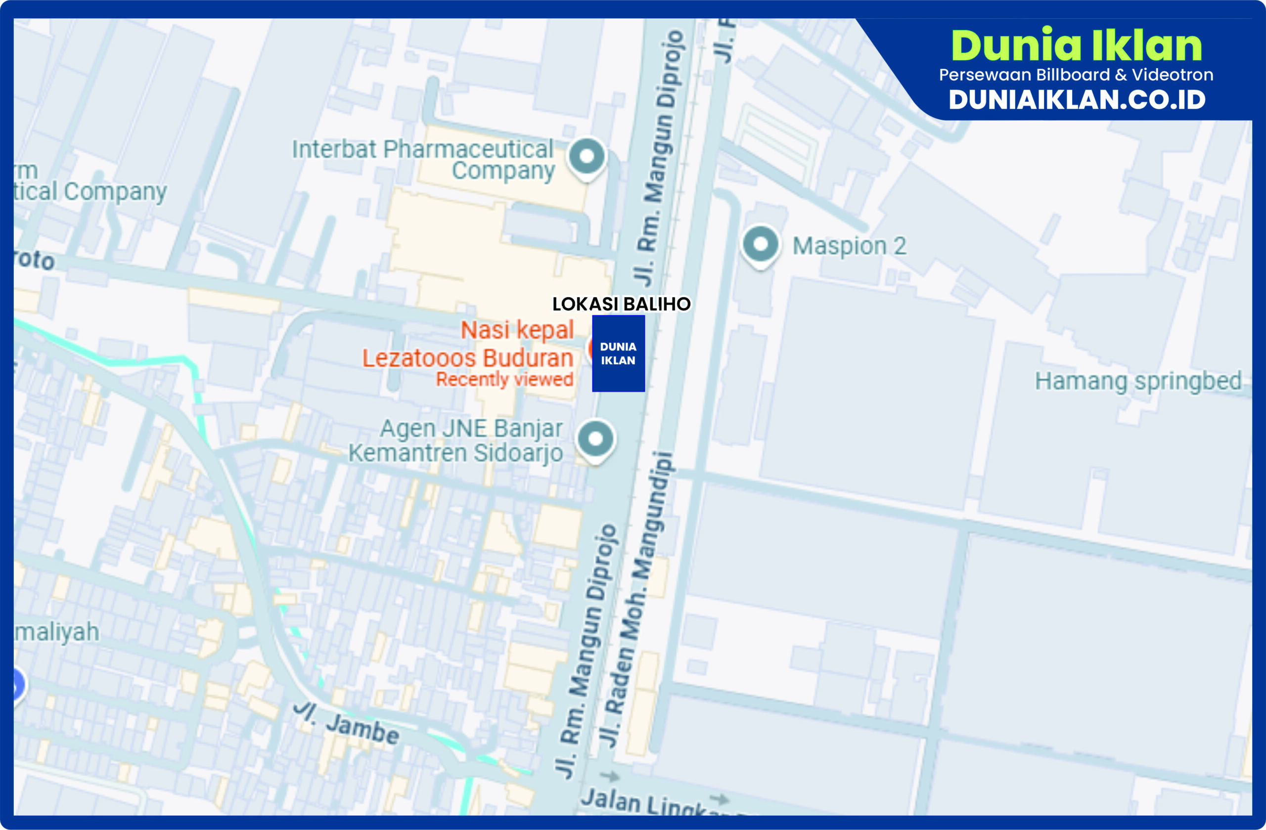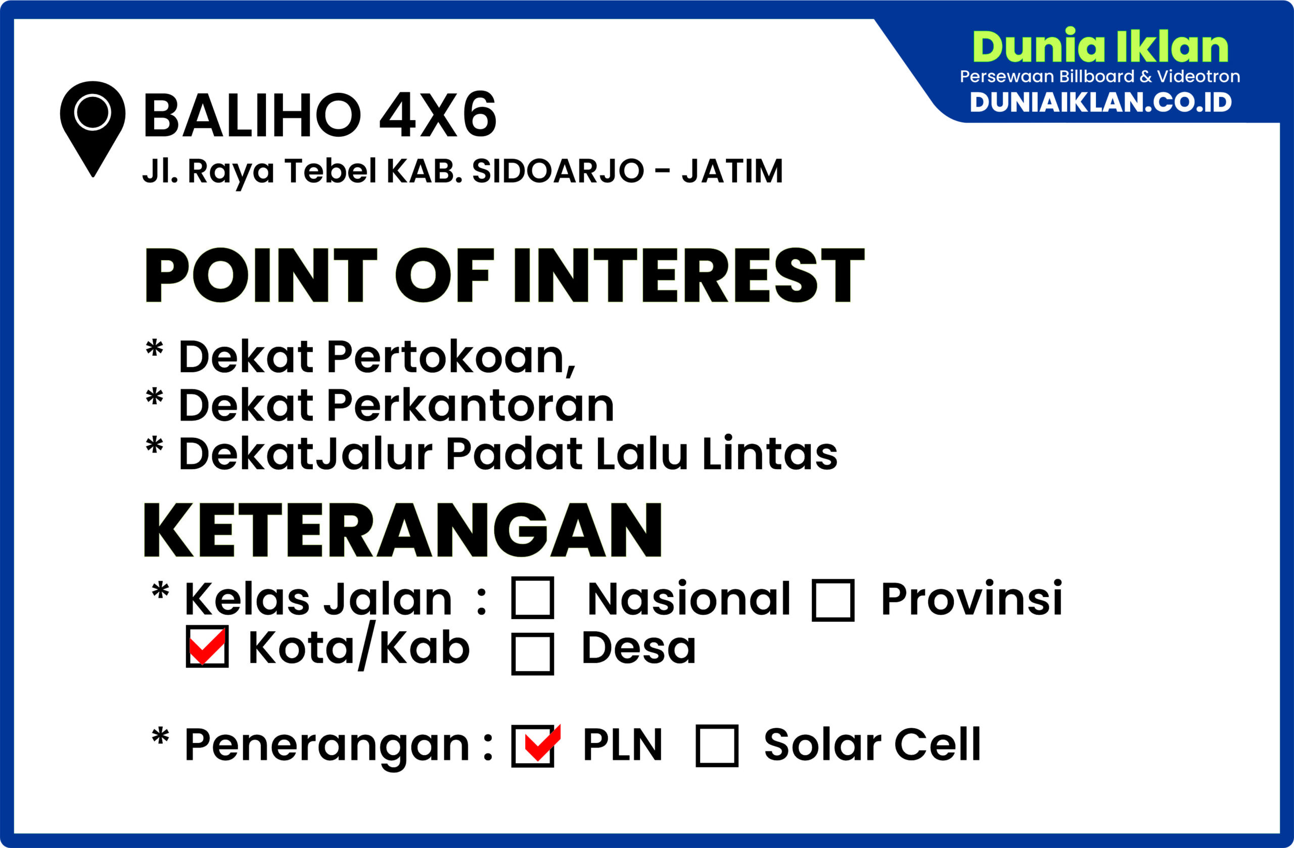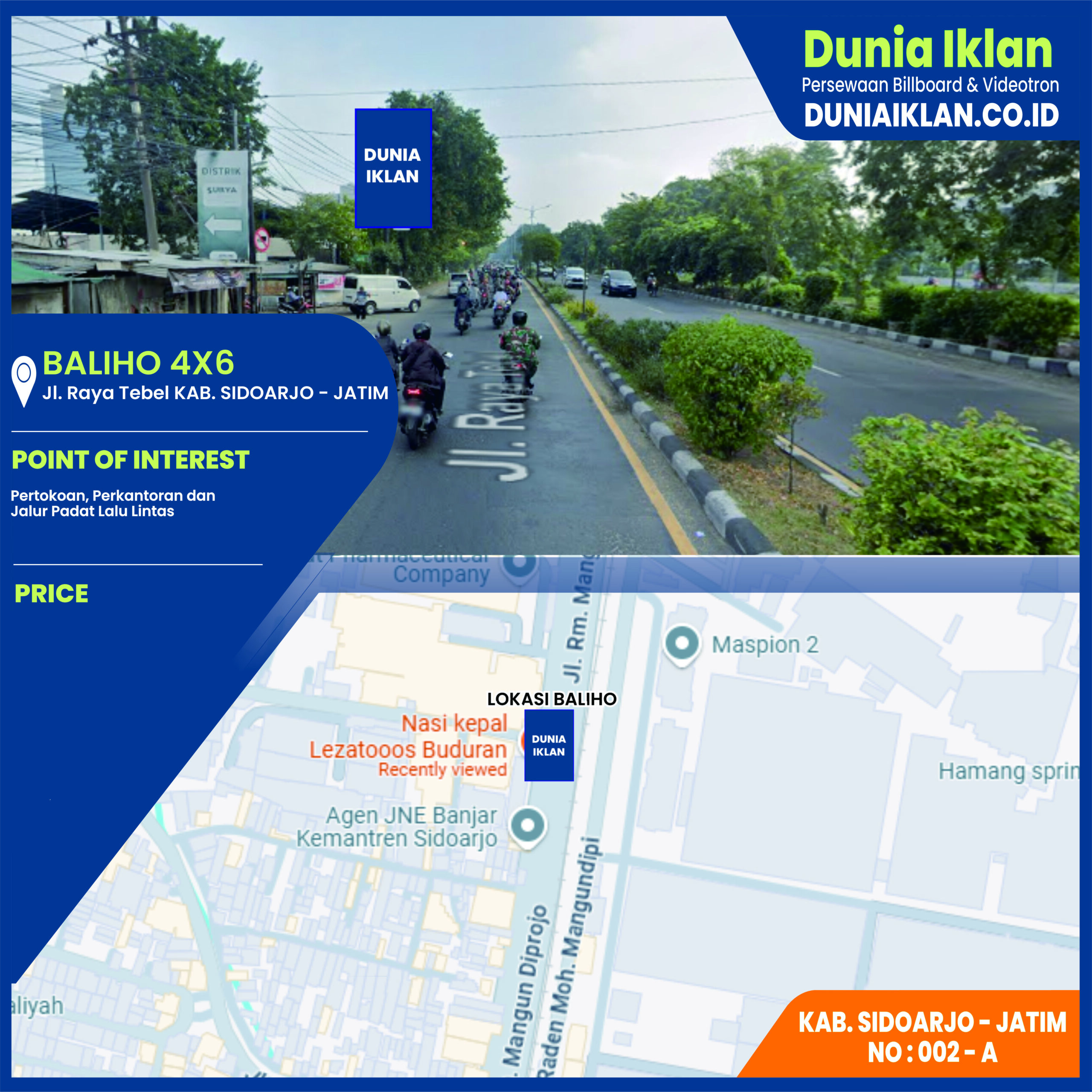 PT. Dunia Iklan Indonesia Jakarta menjadikan partner terbaik anda dalam menemukan kemudahan beriklan di ruang terbuka publik. Kami mempersembahkan ribuan titik-titik media iklan terbaik luar ruang berupa BALIHO, BILLBOARD ataupun VIDEOTRON di seluruh wilayah Indonesia dengan memberikan pilihan yang luas dan mudah diakses sesuai dengan target kebutuhan anda seperti titik Baliho Ukuran 4 x 6 M Vertikal Jl. Raya Tebel Kab. Sidoarjo Jawa Timur ini.