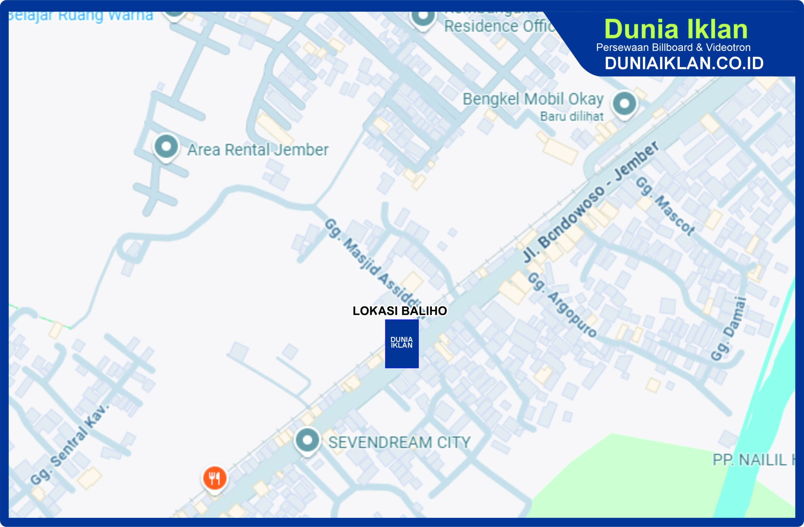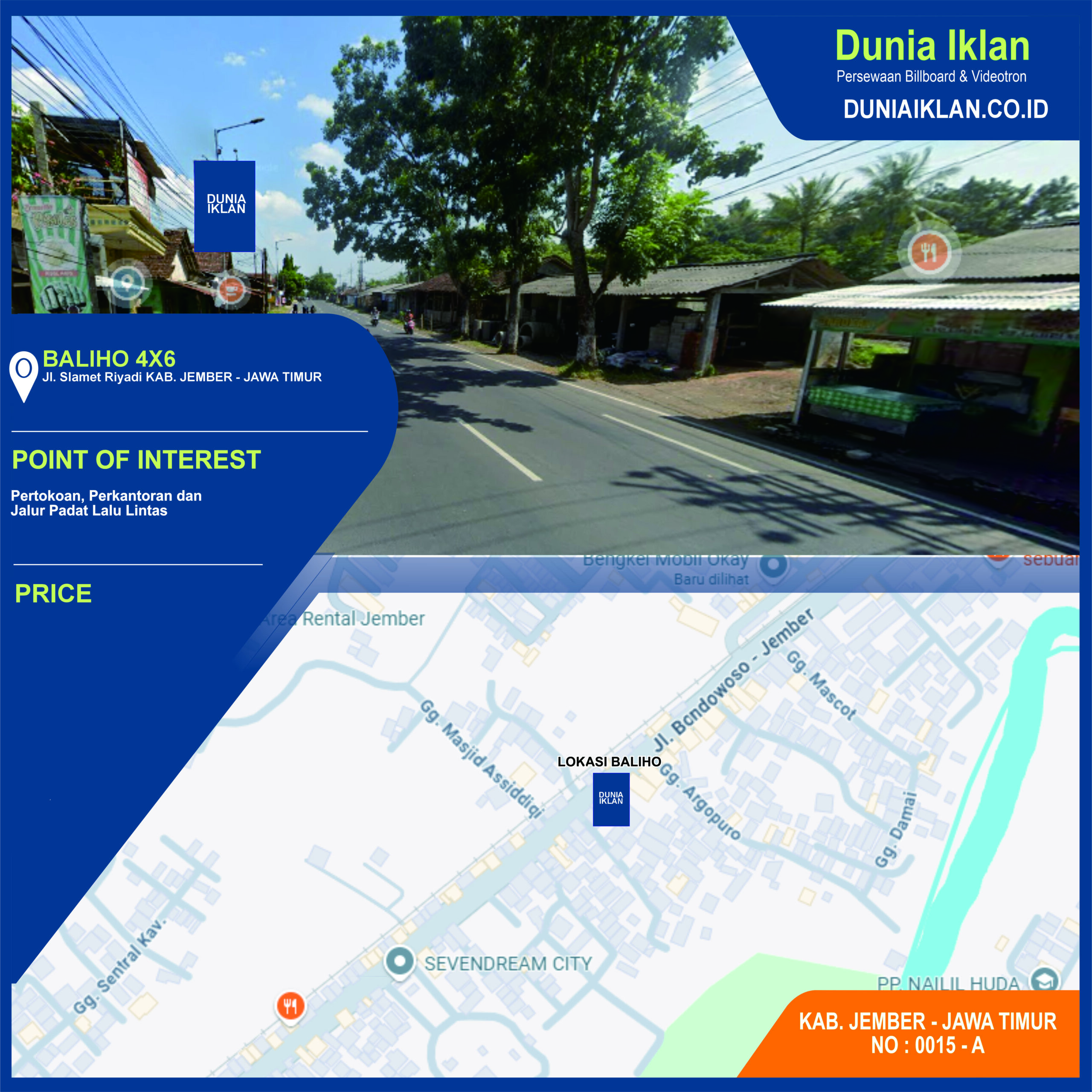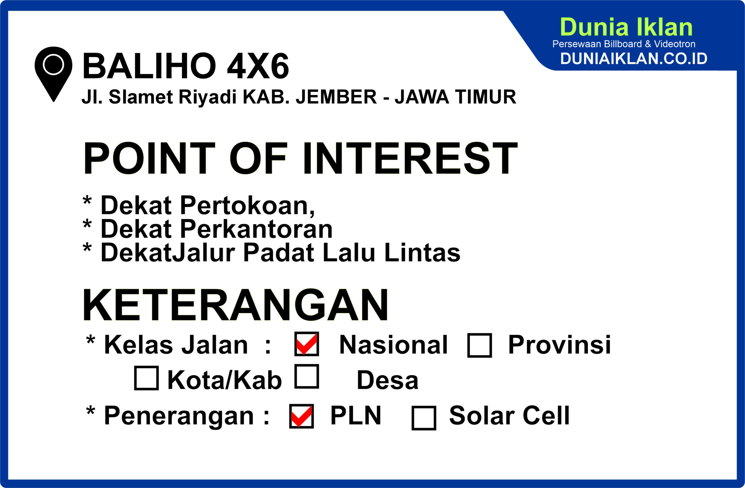 PT. Dunia Iklan Indonesia Jakarta menjadikan partner terbaik anda dalam menemukan kemudahan beriklan di ruang terbuka publik. Kami mempersembahkan ribuan titik-titik media iklan terbaik luar ruang berupa BALIHO, BILLBOARD ataupun VIDEOTRON di seluruh wilayah Indonesia dengan memberikan pilihan yang luas dan mudah diakses sesuai dengan target kebutuhan anda seperti titik Baliho Ukuran 4 x 6 M Vertikal Jl. Slamet Riyadi Jember Jawa Timur ini.