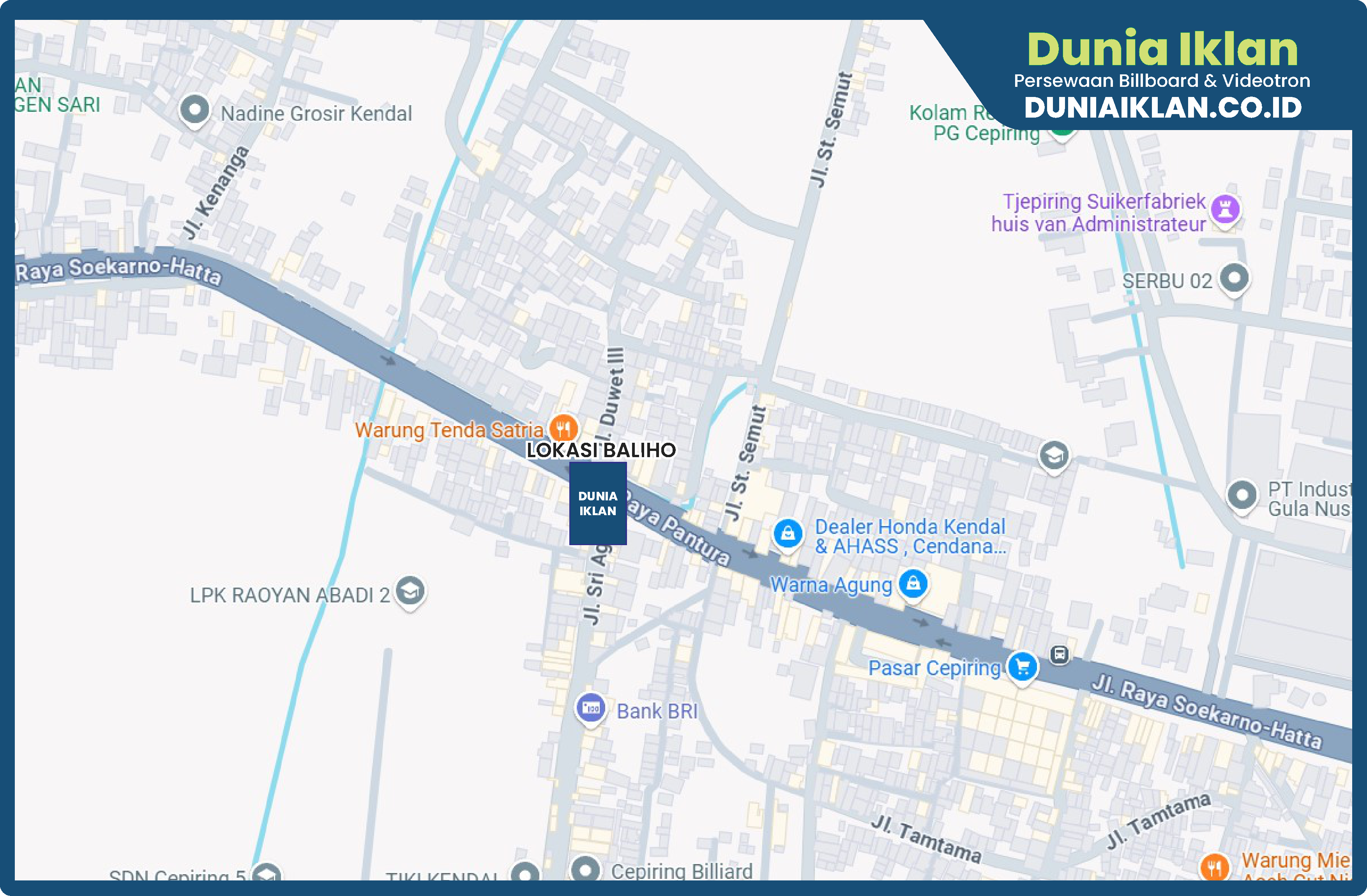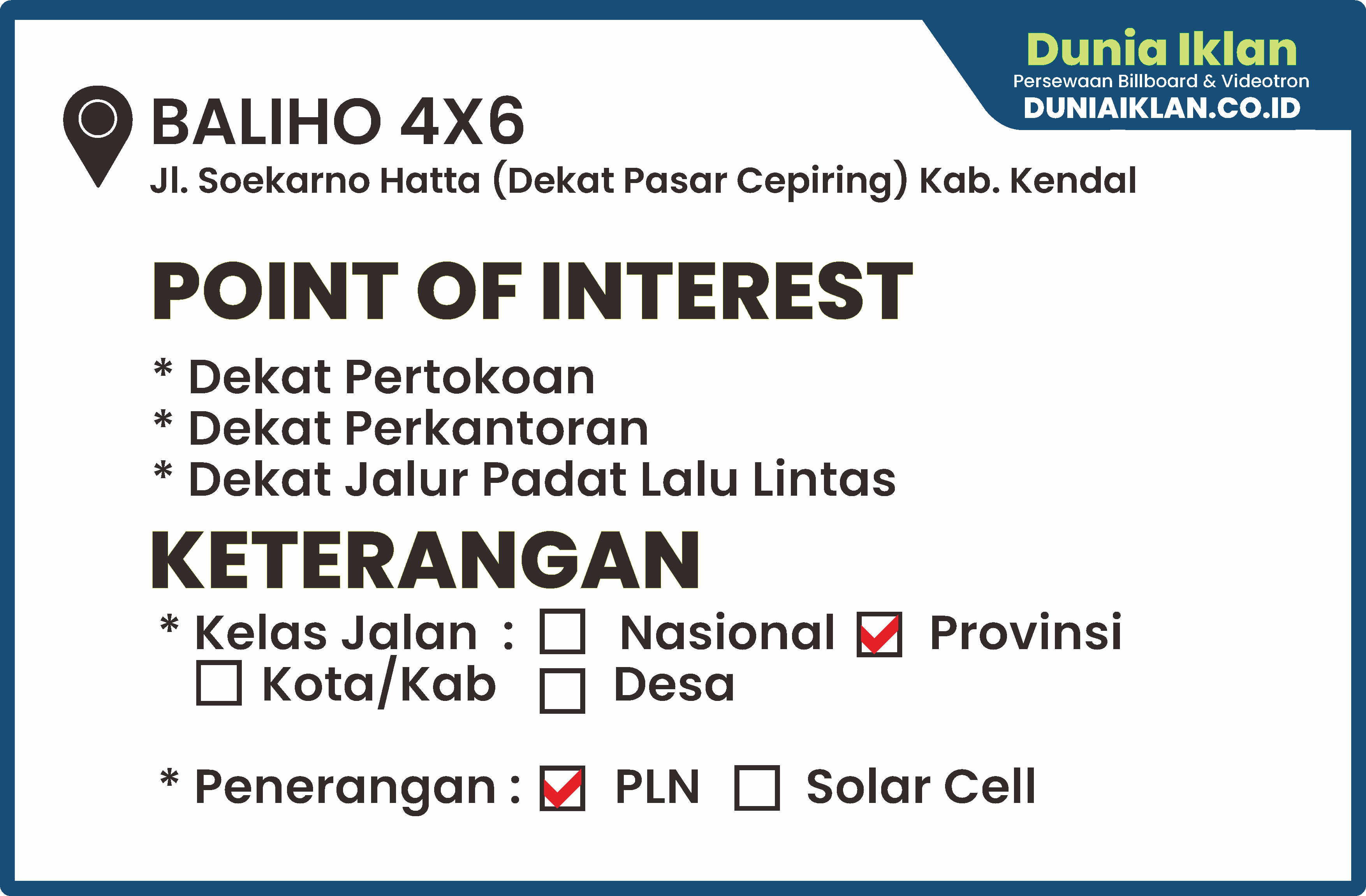 PT. Dunia Iklan Indonesia Jakarta menjadikan partner terbaik anda dalam menemukan kemudahan beriklan di ruang terbuka publik. Kami mempersembahkan ribuan titik-titik media iklan terbaik luar ruang berupa BALIHO, BILLBOARD ataupun VIDEOTRON di seluruh wilayah Indonesia dengan memberikan pilihan yang luas dan mudah diakses sesuai dengan target kebutuhan anda seperti titik Baliho Ukuran 4 x 6 M Vertikal Jl. Soekarno Hatta Kab. Kendal – Jawa Tengah ini.