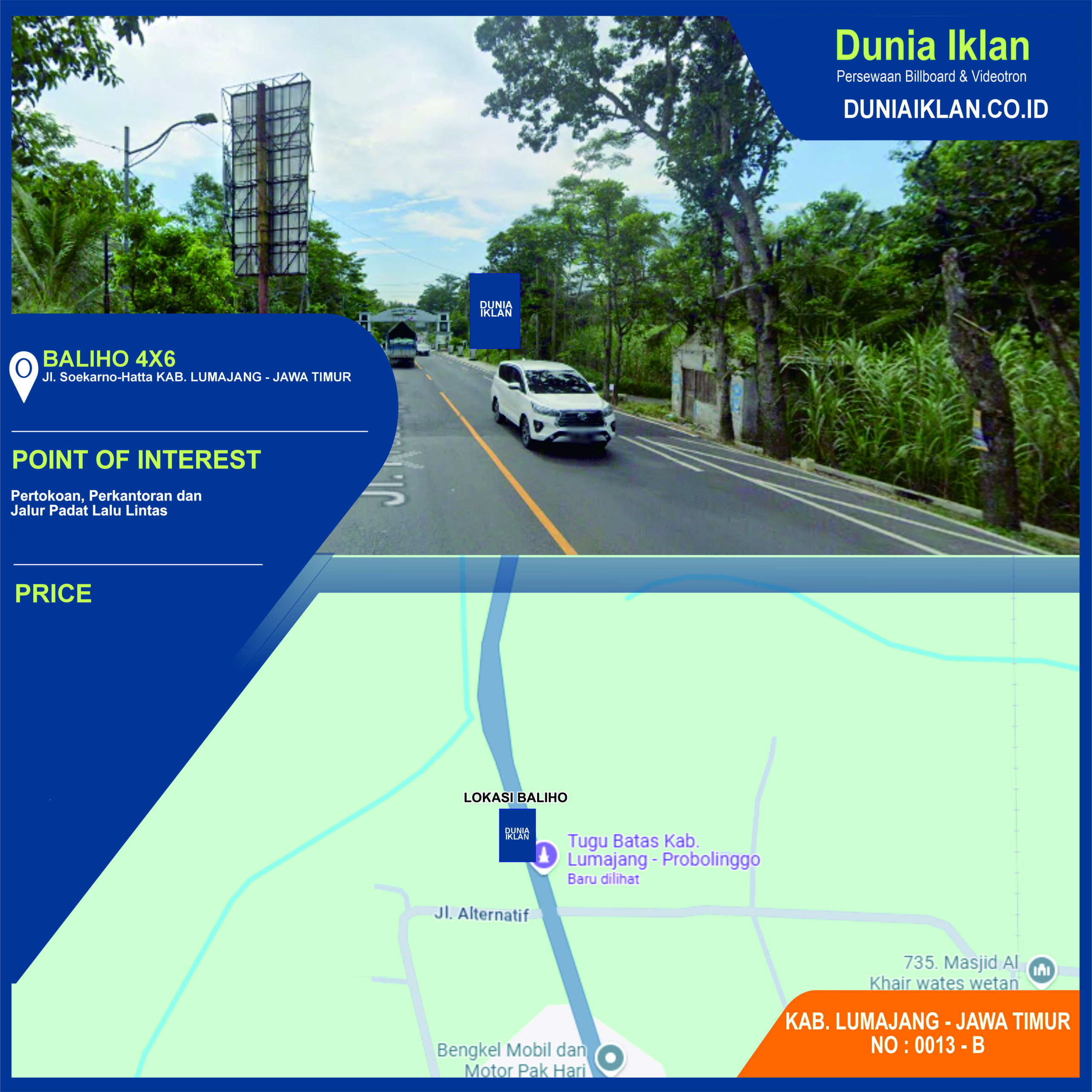 PT. Dunia Iklan Indonesia Jakarta menjadikan partner terbaik anda dalam menemukan kemudahan beriklan di ruang terbuka publik. Kami mempersembahkan ribuan titik-titik media iklan terbaik luar ruang berupa BALIHO, BILLBOARD ataupun VIDEOTRON di seluruh wilayah Indonesia dengan memberikan pilihan yang luas dan mudah diakses sesuai dengan target kebutuhan anda seperti titik Baliho Ukuran 4 x 6 M Vertikal Jl. Sukarno Hatta, Wates Lumajang Jawa Timur ini.