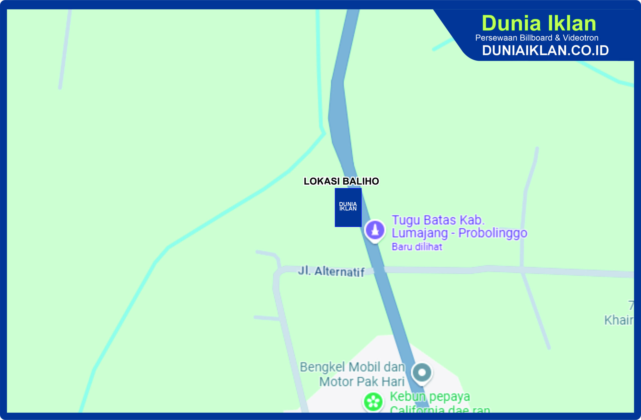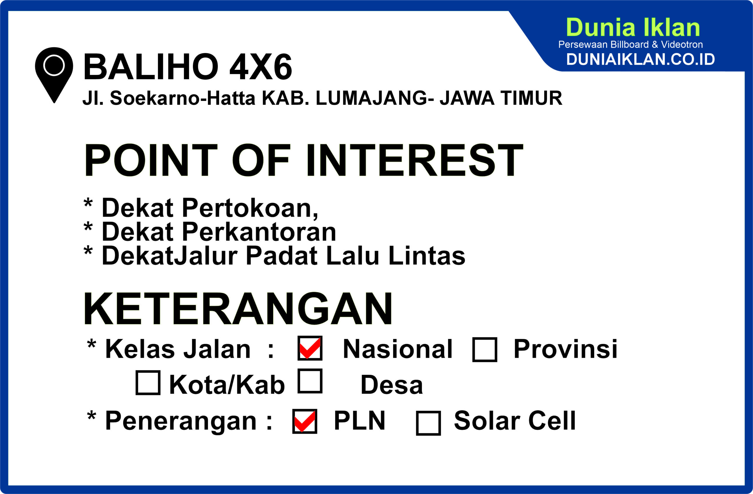 PT. Dunia Iklan Indonesia Jakarta menjadikan partner terbaik anda dalam menemukan kemudahan beriklan di ruang terbuka publik. Kami mempersembahkan ribuan titik-titik media iklan terbaik luar ruang berupa BALIHO, BILLBOARD ataupun VIDEOTRON di seluruh wilayah Indonesia dengan memberikan pilihan yang luas dan mudah diakses sesuai dengan target kebutuhan anda seperti titik Baliho Ukuran 4 x 6 M Vertikal Jl. Sukarno Hatta, Wates (Sisi 2) Lumajang Jawa Timur ini.