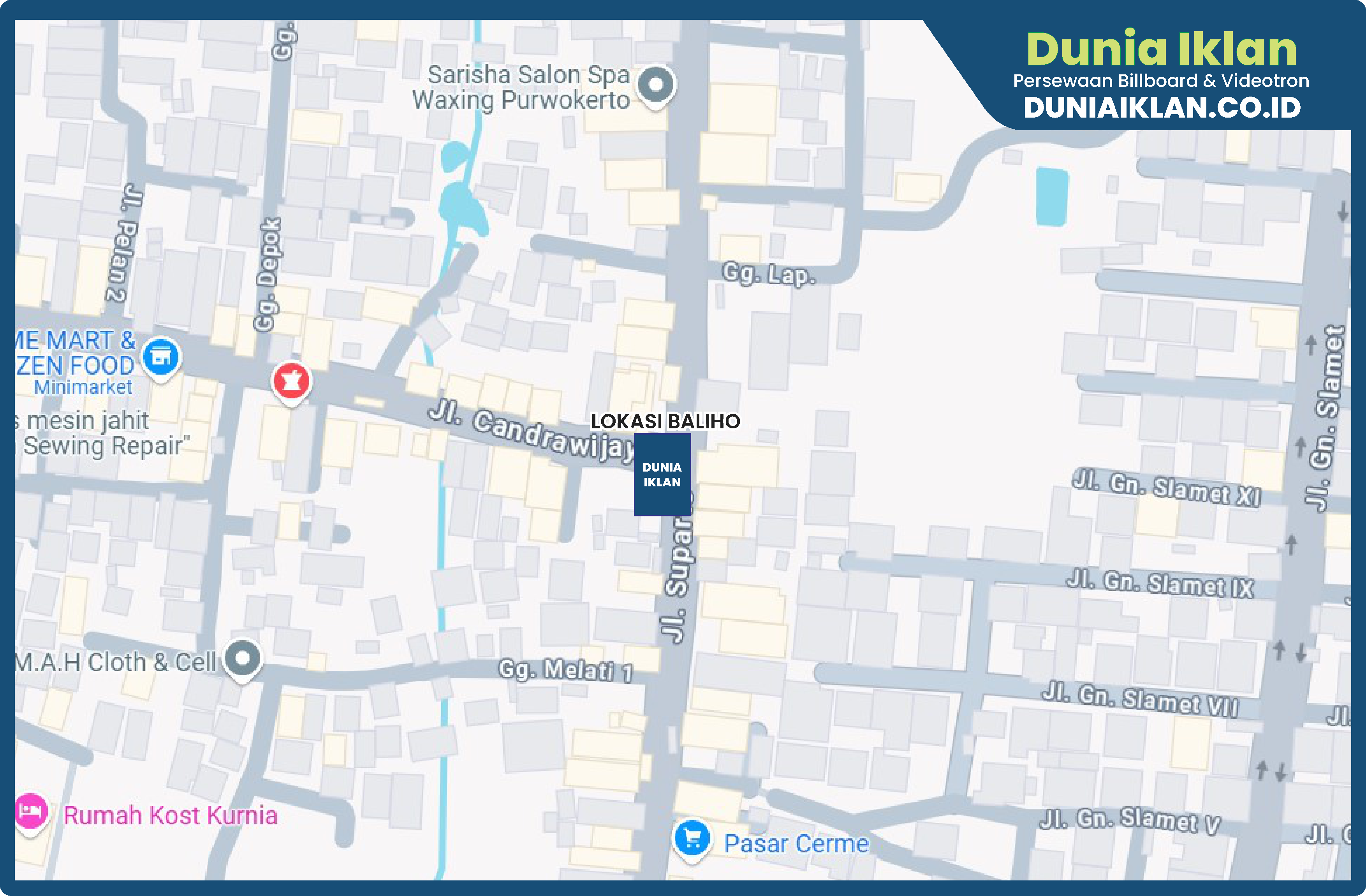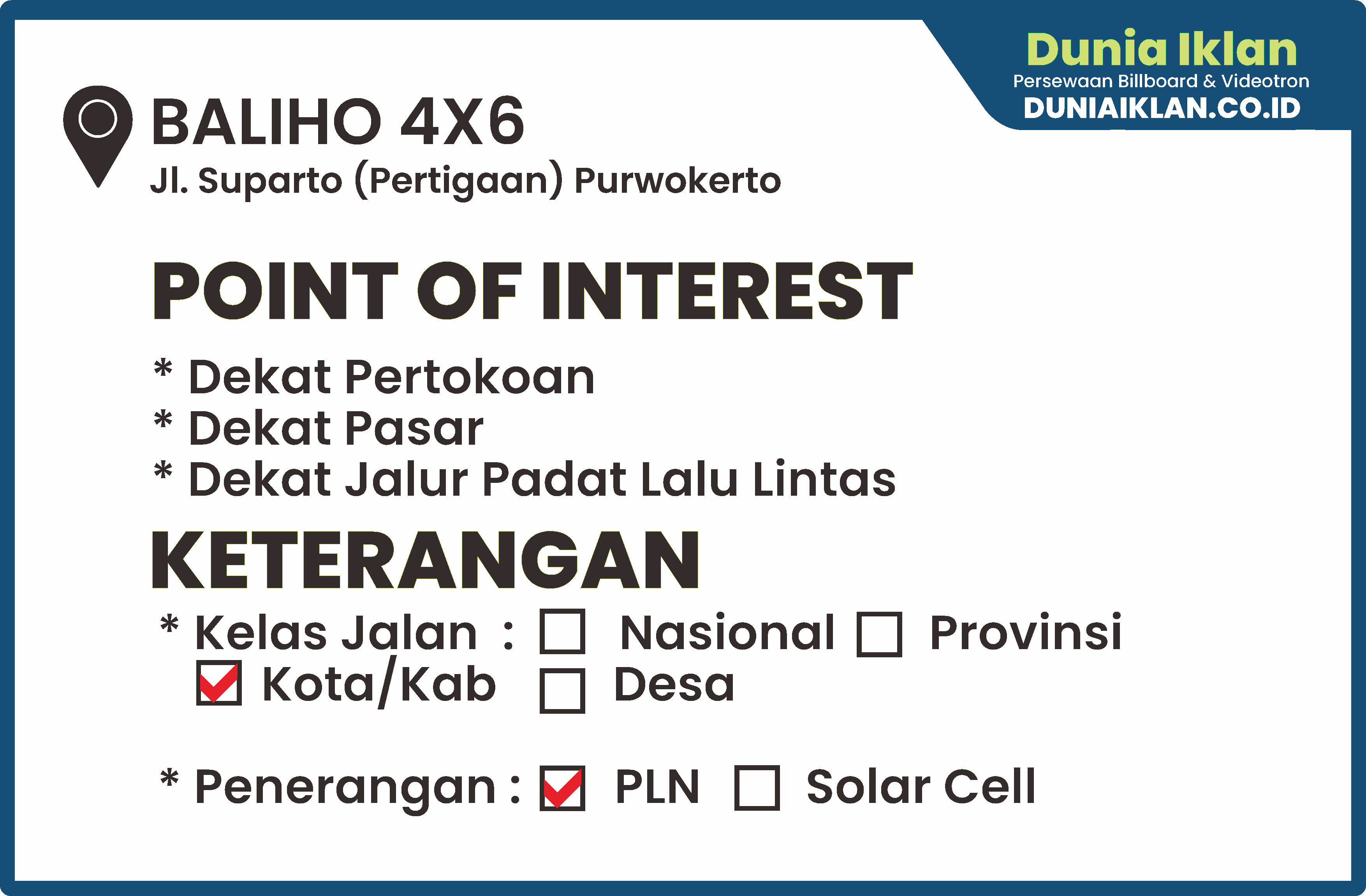 PT. Dunia Iklan Indonesia Jakarta menjadikan partner terbaik anda dalam menemukan kemudahan beriklan di ruang terbuka publik. Kami mempersembahkan ribuan titik-titik media iklan terbaik luar ruang berupa BALIHO, BILLBOARD ataupun VIDEOTRON di seluruh wilayah Indonesia dengan memberikan pilihan yang luas dan mudah diakses sesuai dengan target kebutuhan anda seperti titik Baliho Ukuran 4 x 6 M Vertikal Jl. Suprapto Kab. Purwokerto – Jawa Tengah ini.