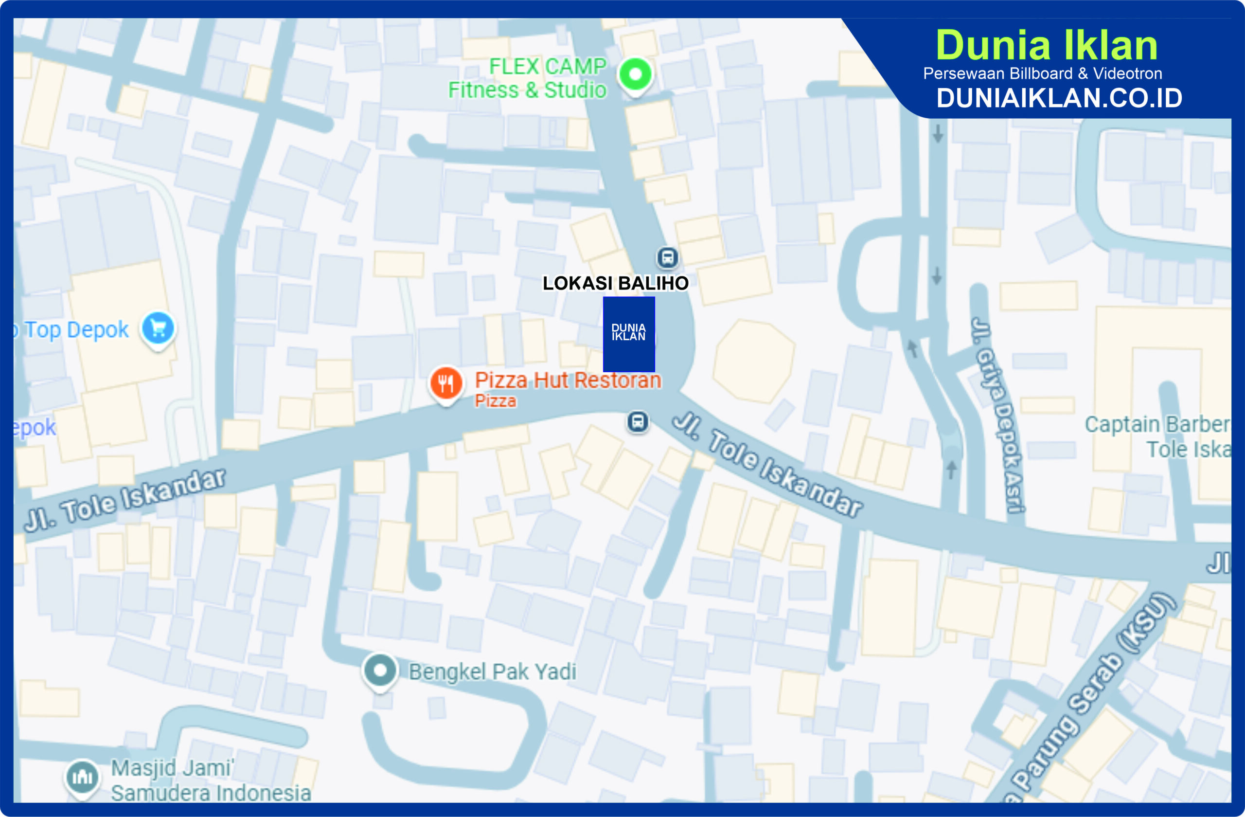 PT. Dunia Iklan Indonesia Jakarta menjadikan partner terbaik anda dalam menemukan kemudahan beriklan di ruang terbuka publik. Kami mempersembahkan ribuan titik-titik media iklan terbaik luar ruang berupa BALIHO, BILLBOARD ataupun VIDEOTRON di seluruh wilayah Indonesia dengan memberikan pilihan yang luas dan mudah diakses sesuai dengan target kebutuhan anda seperti titik Baliho Ukuran 4 x 6 M Vertikal Jl. Tole Iskandar Kota Depok – Jawa Barat ini.