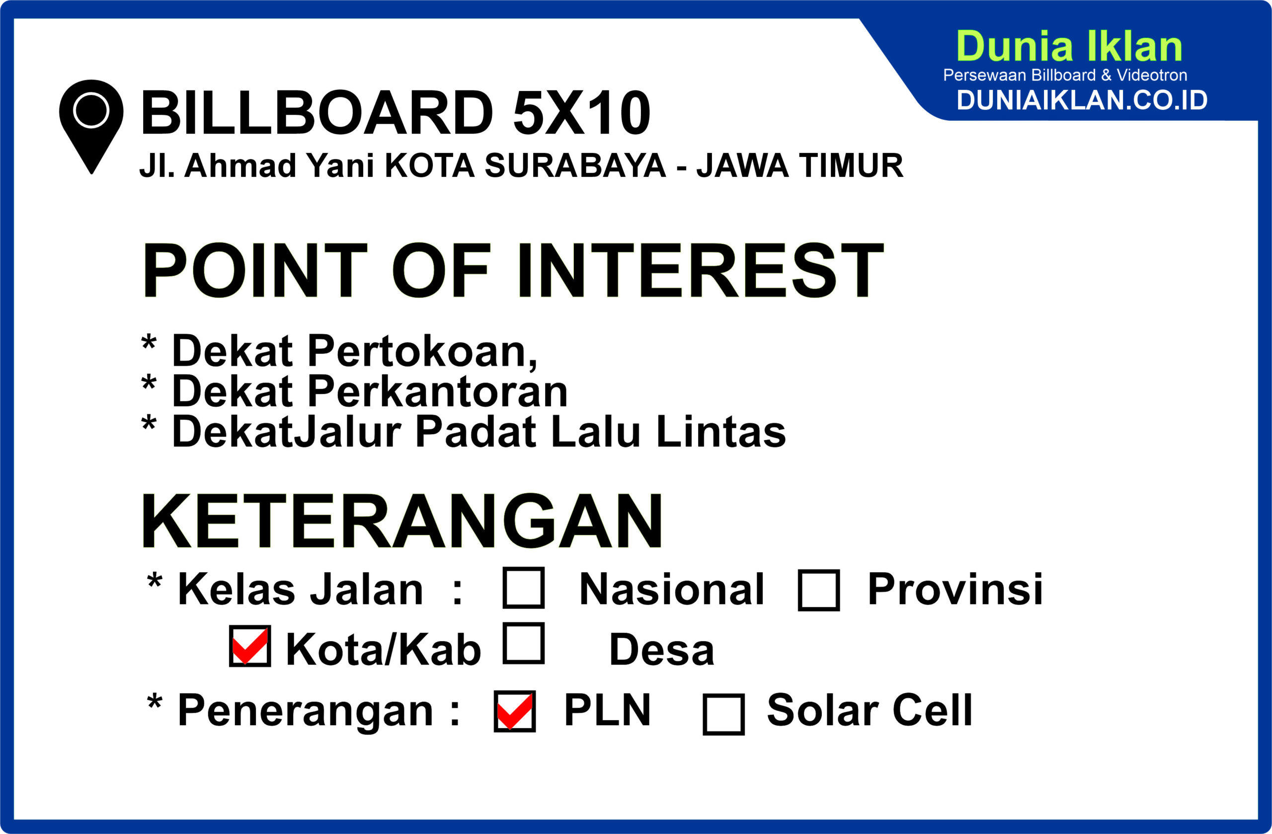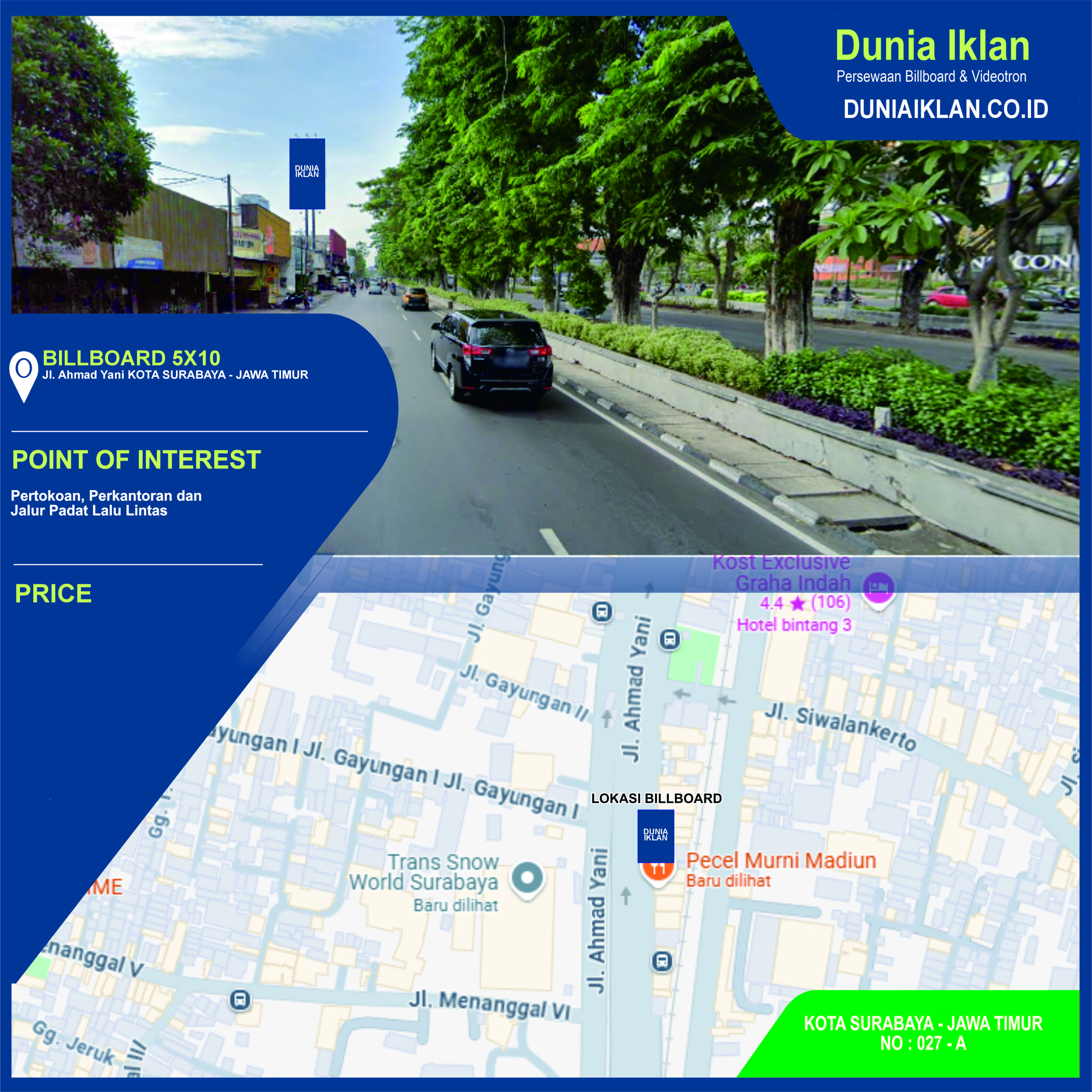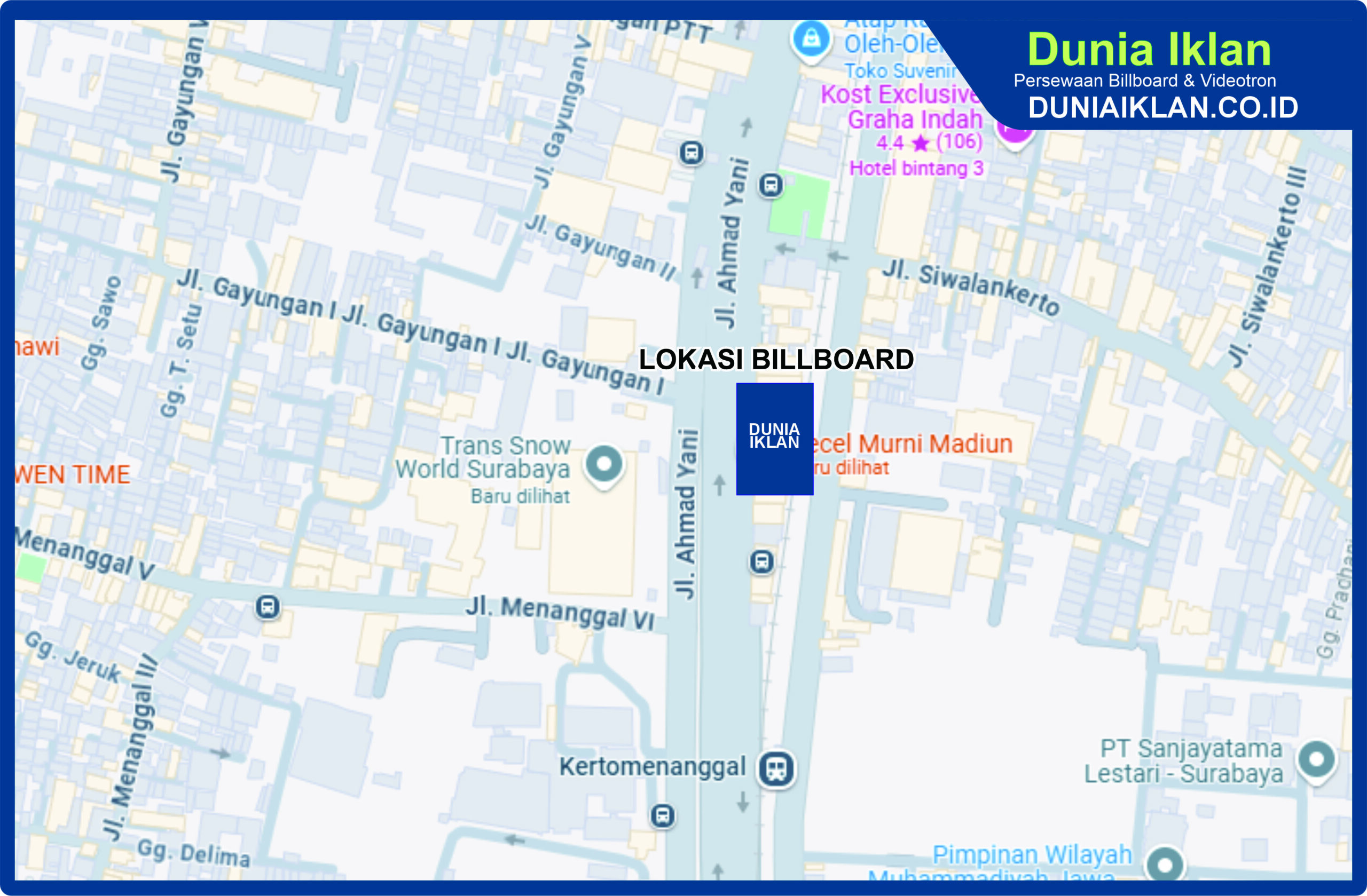 PT. Dunia Iklan Indonesia Jakarta menjadikan partner terbaik anda dalam menemukan kemudahan beriklan di ruang terbuka publik. Kami mempersembahkan ribuan titik-titik media iklan terbaik luar ruang berupa BALIHO, BILLBOARD ataupun VIDEOTRON di seluruh wilayah Indonesia dengan memberikan pilihan yang luas dan mudah diakses sesuai dengan target kebutuhan anda seperti titikĀ Billboard Ukuran 5 x 10 M Vertikal Jl. Ahmad Yani Surabaya Jawa Timur ini.