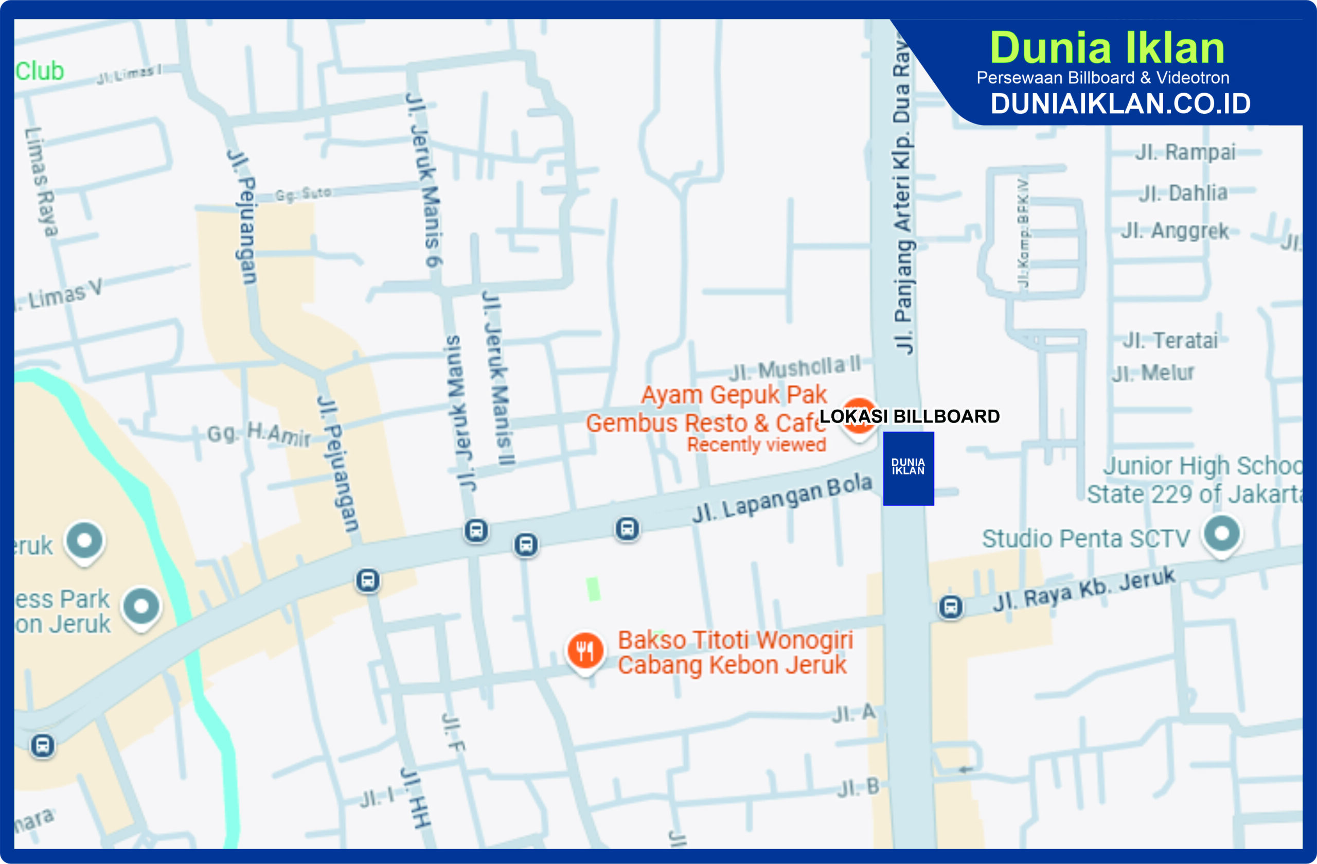 Bisa dipastikan Billboard Ukuran 10 x 5 Meter Horisontal Jl. Lapangan Bola Jakarta Barat ini memberikan benefit berupa kemudahan akses dan visibiity yang bagus untuk ditemukan dan menarik perhatian viewer anda.
