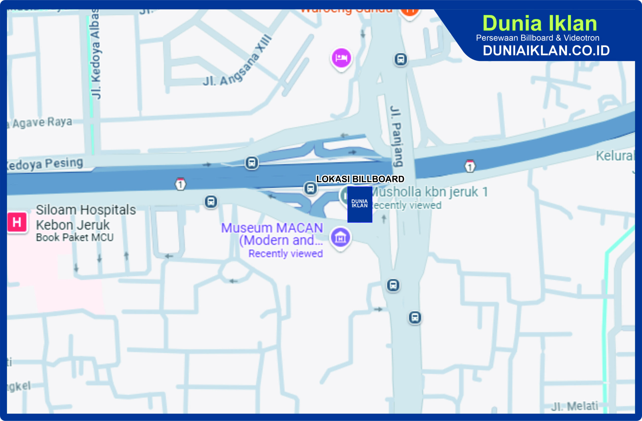 Bisa dipastikan Billboard Ukuran 10 x 5 Meter Horisontal Jl. Panjang Kec. Kebon Jeruk Jakarta Barat ini memberikan benefit berupa kemudahan akses dan visibiity yang bagus untuk ditemukan dan menarik perhatian viewer anda.