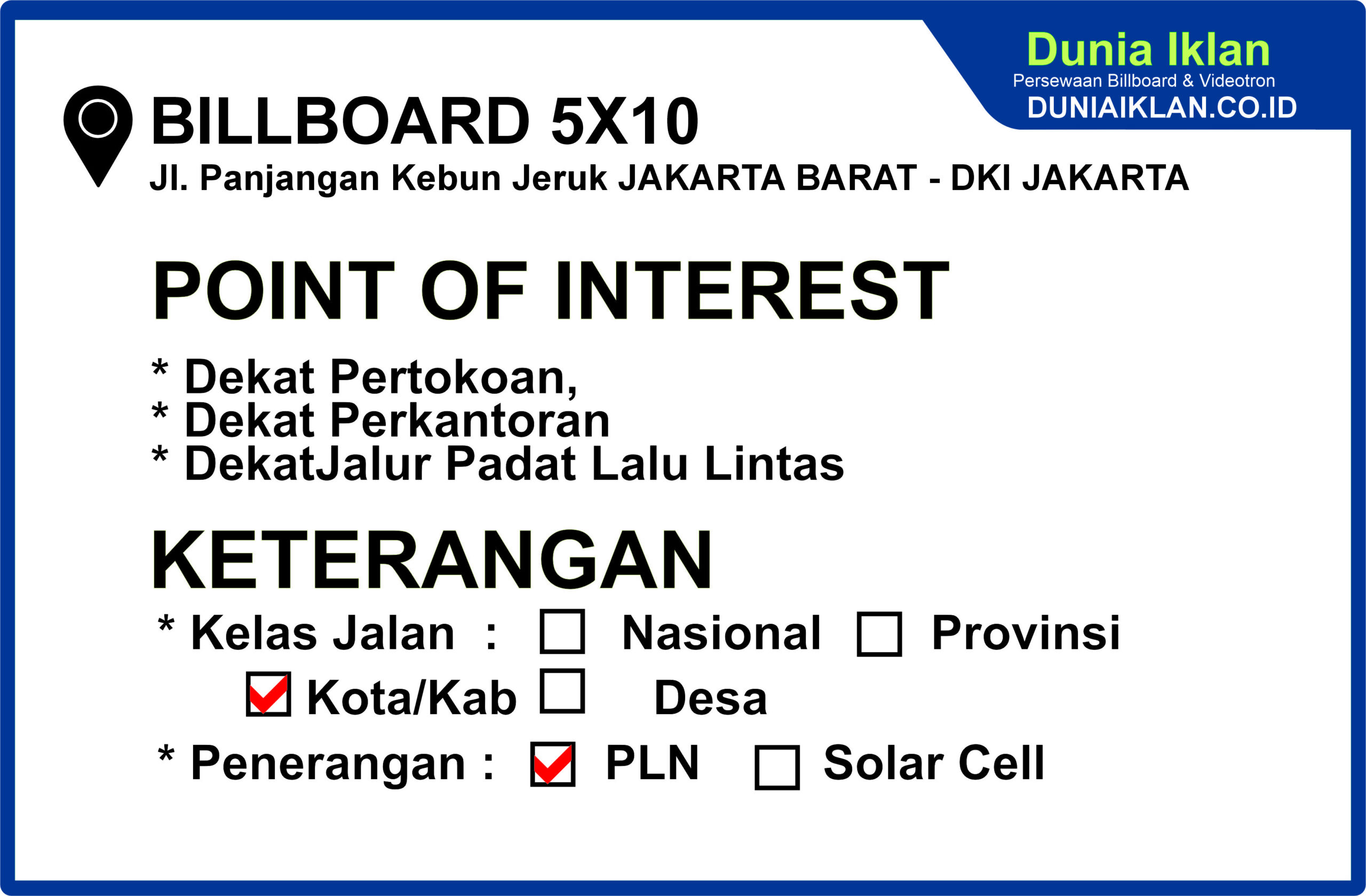 PT. Dunia Iklan Indonesia Jakarta menjadikan partner terbaik anda dalam menemukan kemudahan beriklan di ruang terbuka publik. Kami mempersembahkan ribuan titik-titik media iklan terbaik luar ruang berupa BALIHO, BILLBOARD ataupun VIDEOTRON di seluruh wilayah Indonesia dengan memberikan pilihan yang luas dan mudah diakses sesuai dengan target kebutuhan anda seperti titikĀ Billboard Ukuran 10 x 5 Meter Horisontal Jl. Panjang Kec. Kebon Jeruk Jakarta Barat ini.