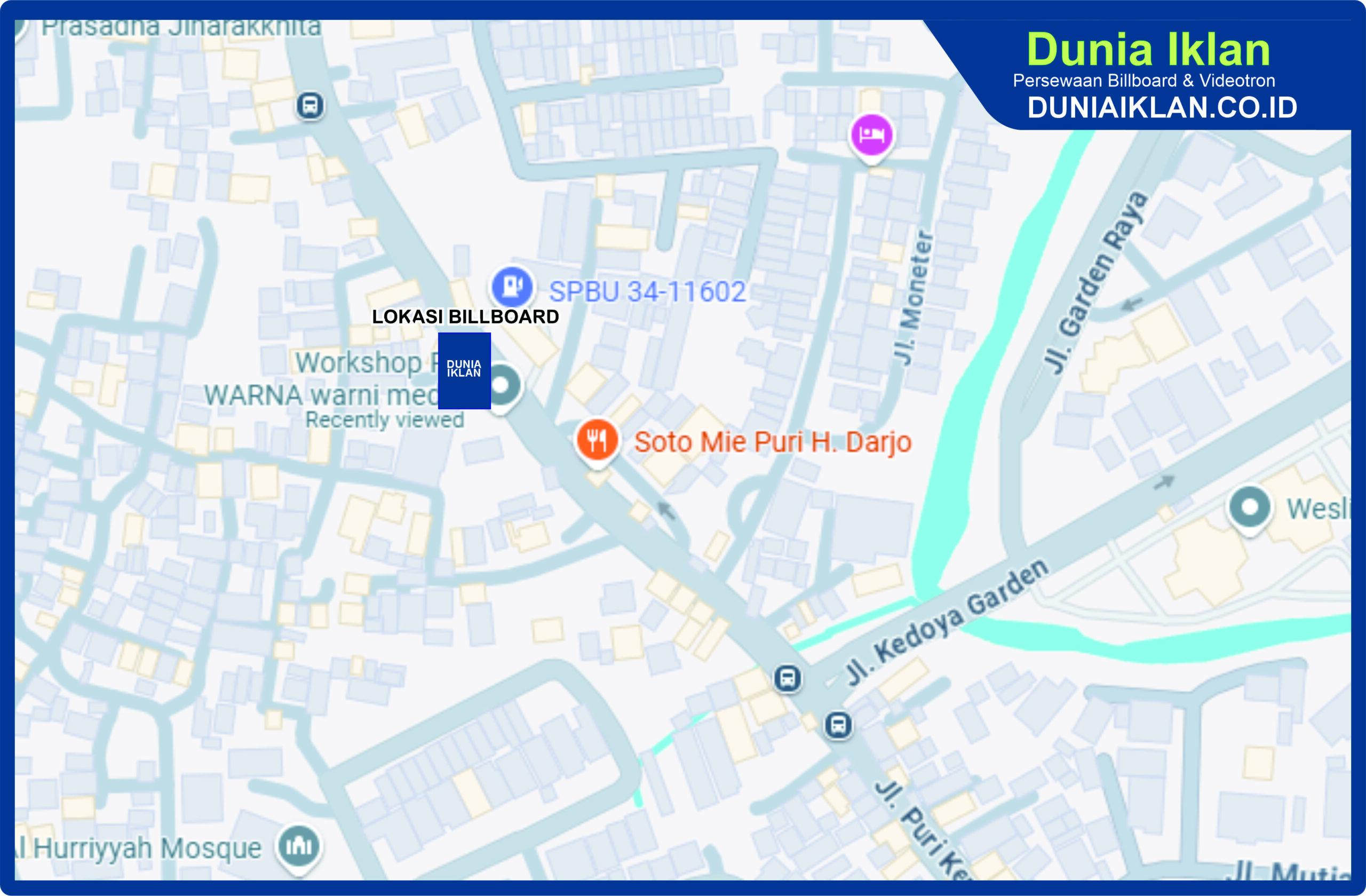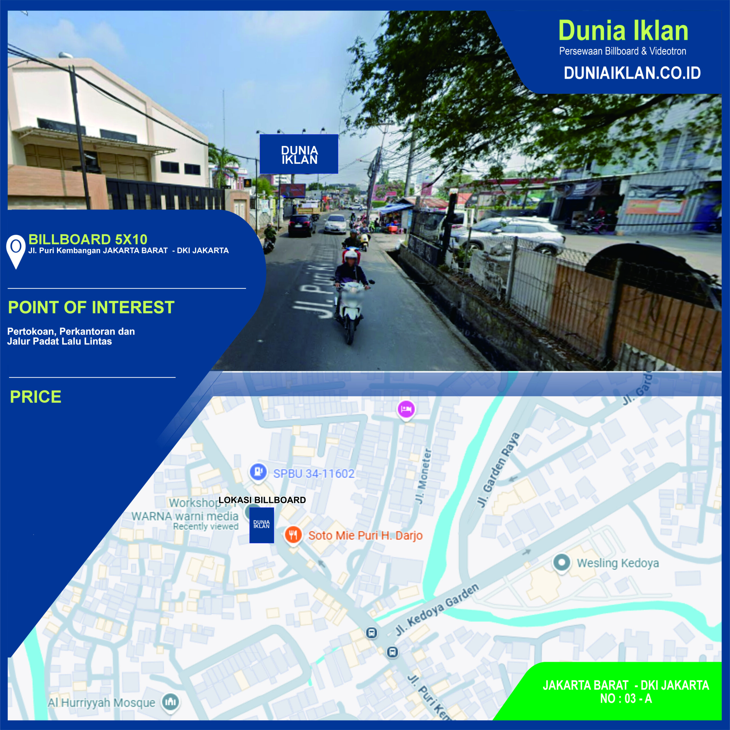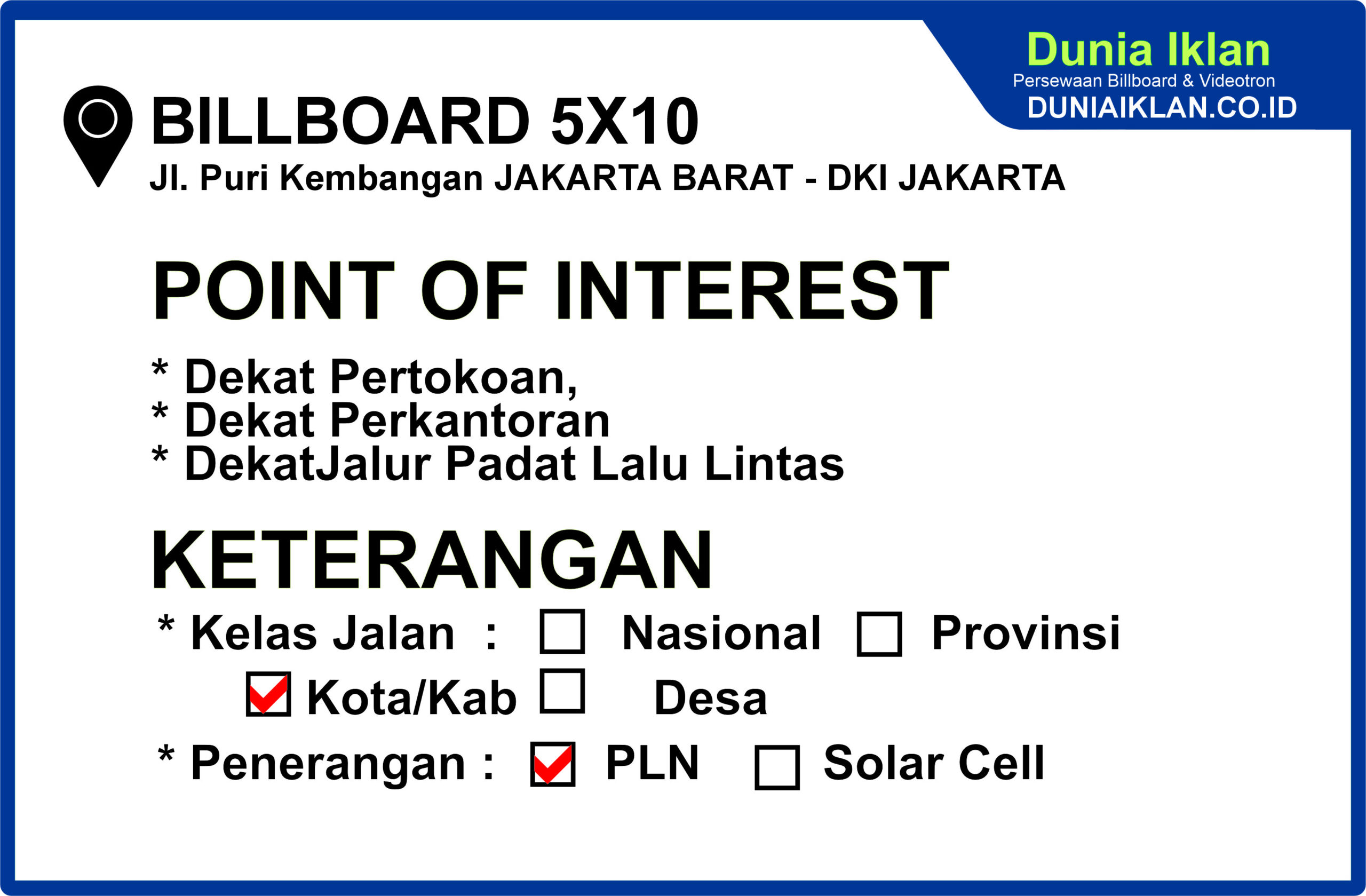 PT. Dunia Iklan Indonesia Jakarta menjadikan partner terbaik anda dalam menemukan kemudahan beriklan di ruang terbuka publik. Kami mempersembahkan ribuan titik-titik media iklan terbaik luar ruang berupa BALIHO, BILLBOARD ataupun VIDEOTRON di seluruh wilayah Indonesia dengan memberikan pilihan yang luas dan mudah diakses sesuai dengan target kebutuhan anda seperti titikĀ Billboard Ukuran 10 x 5 Meter Horisontal Jl. Puri Kembangan Jakarta Barat ini.