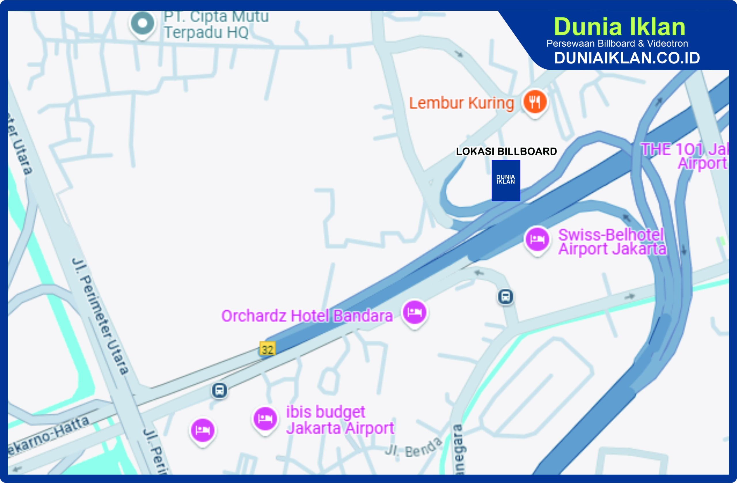 PT. Dunia Iklan Indonesia Jakarta menjadikan partner terbaik anda dalam menemukan kemudahan beriklan di ruang terbuka publik. Kami mempersembahkan ribuan titik-titik media iklan terbaik luar ruang berupa BALIHO, BILLBOARD ataupun VIDEOTRON di seluruh wilayah Indonesia dengan memberikan pilihan yang luas dan mudah diakses sesuai dengan target kebutuhan anda seperti titikĀ Billboard Ukuran 10 x 20 Meter Horisontal Jl. Tol Sedyatmo Tangerang ini.