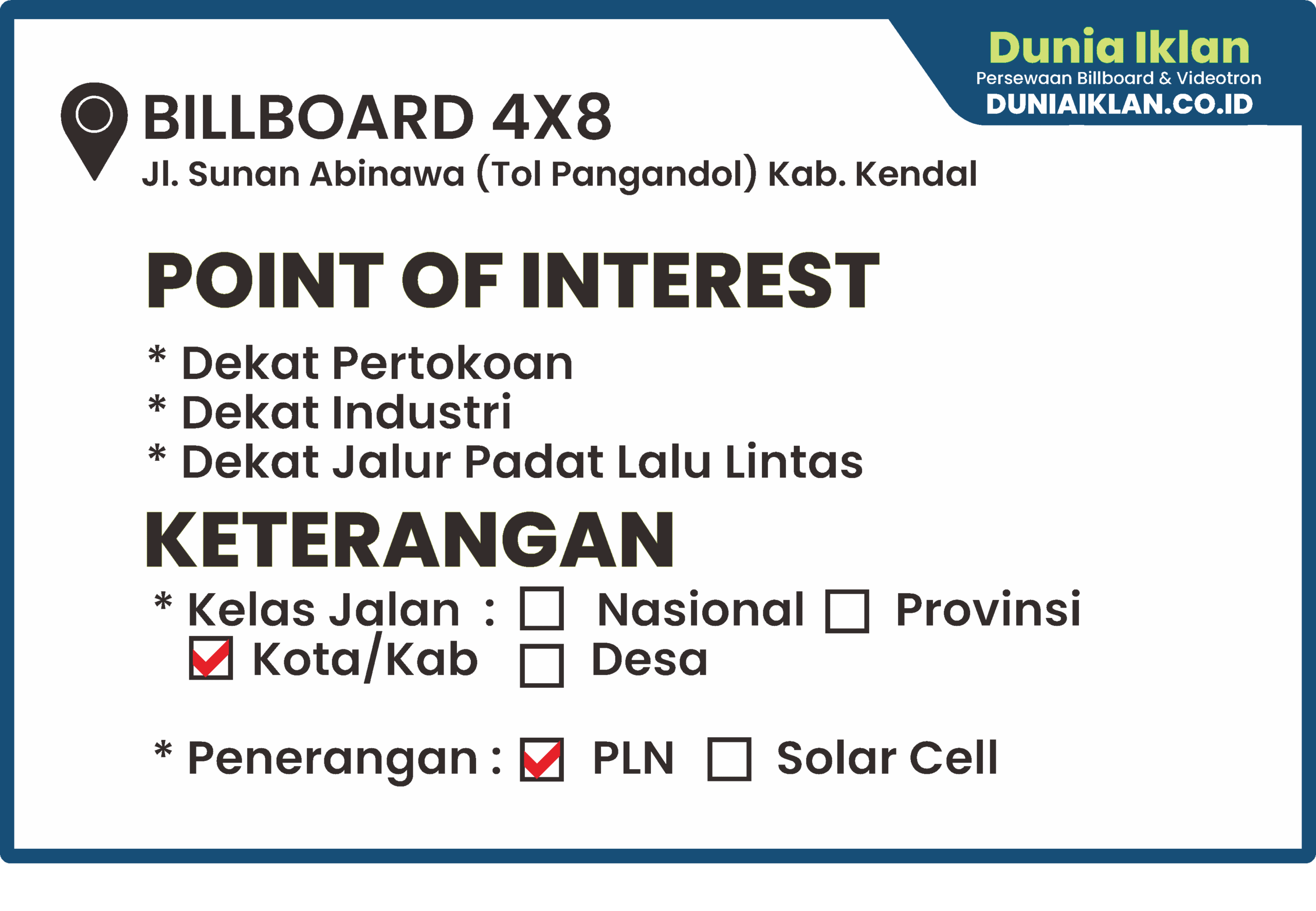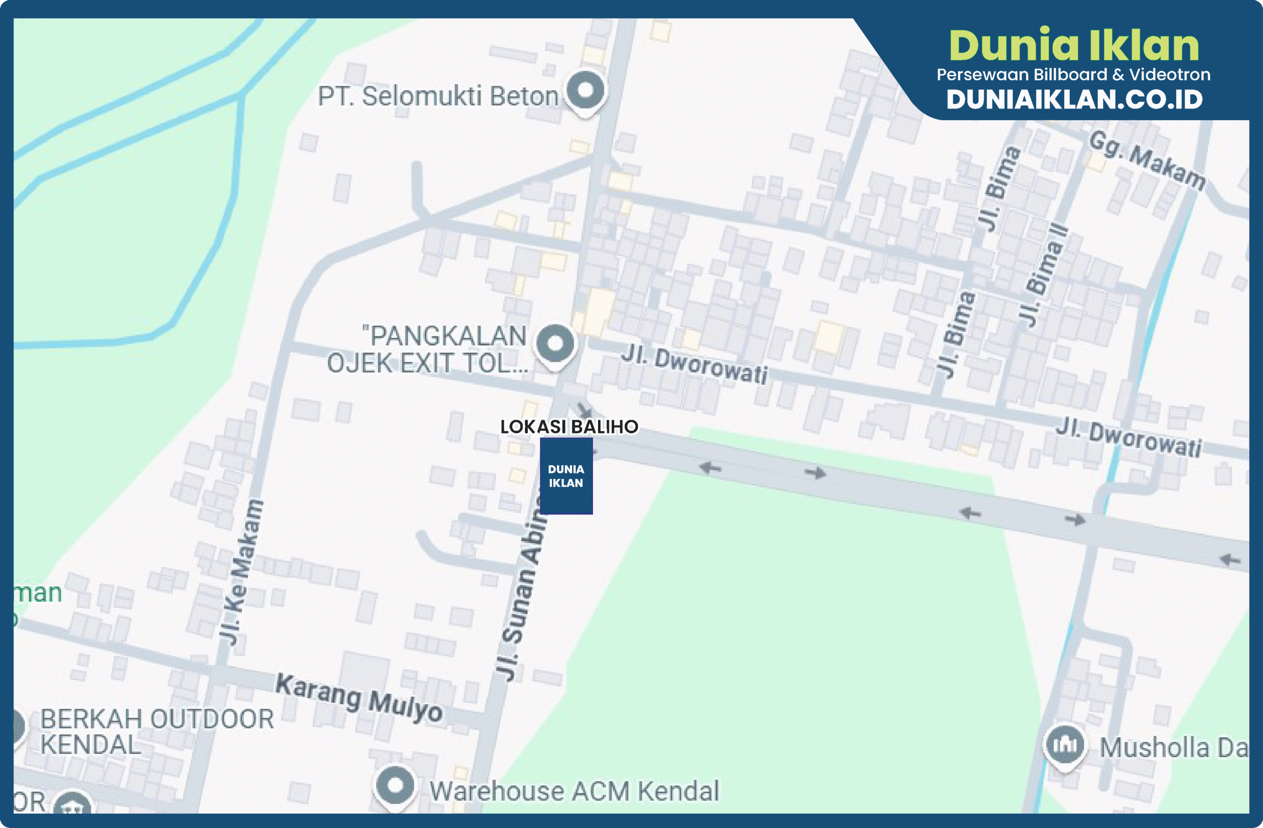 PT. Dunia Iklan Indonesia Jakarta menjadikan partner terbaik anda dalam menemukan kemudahan beriklan di ruang terbuka publik. Kami mempersembahkan ribuan titik-titik media iklan terbaik luar ruang berupa BALIHO, BILLBOARD ataupun VIDEOTRON di seluruh wilayah Indonesia dengan memberikan pilihan yang luas dan mudah diakses sesuai dengan target kebutuhan anda seperti titikĀ Billboard Ukuran 4 x 8 M Horizontal Jl. Sunan Abinawa (Tol Pengandol) Kab. Kendal – Jawa Tengah ini.