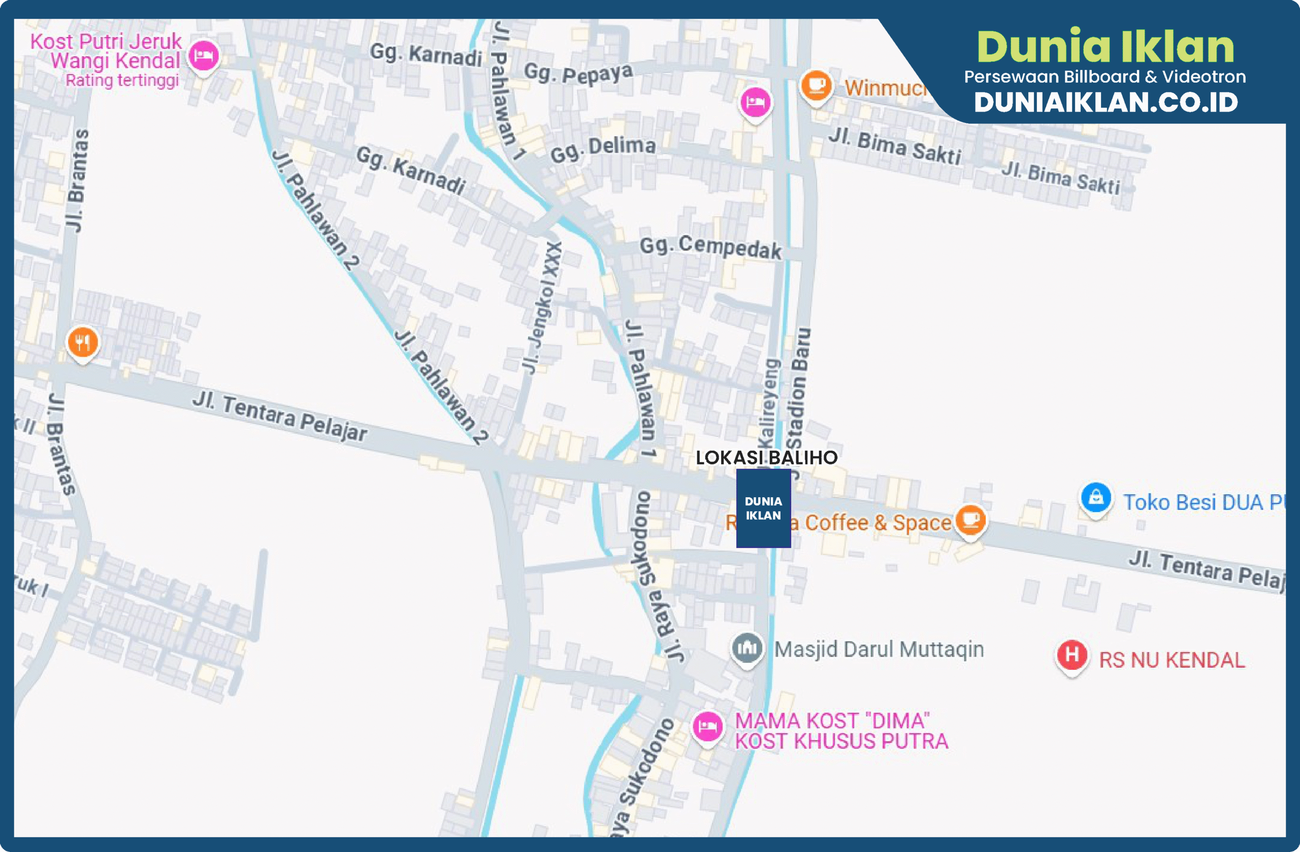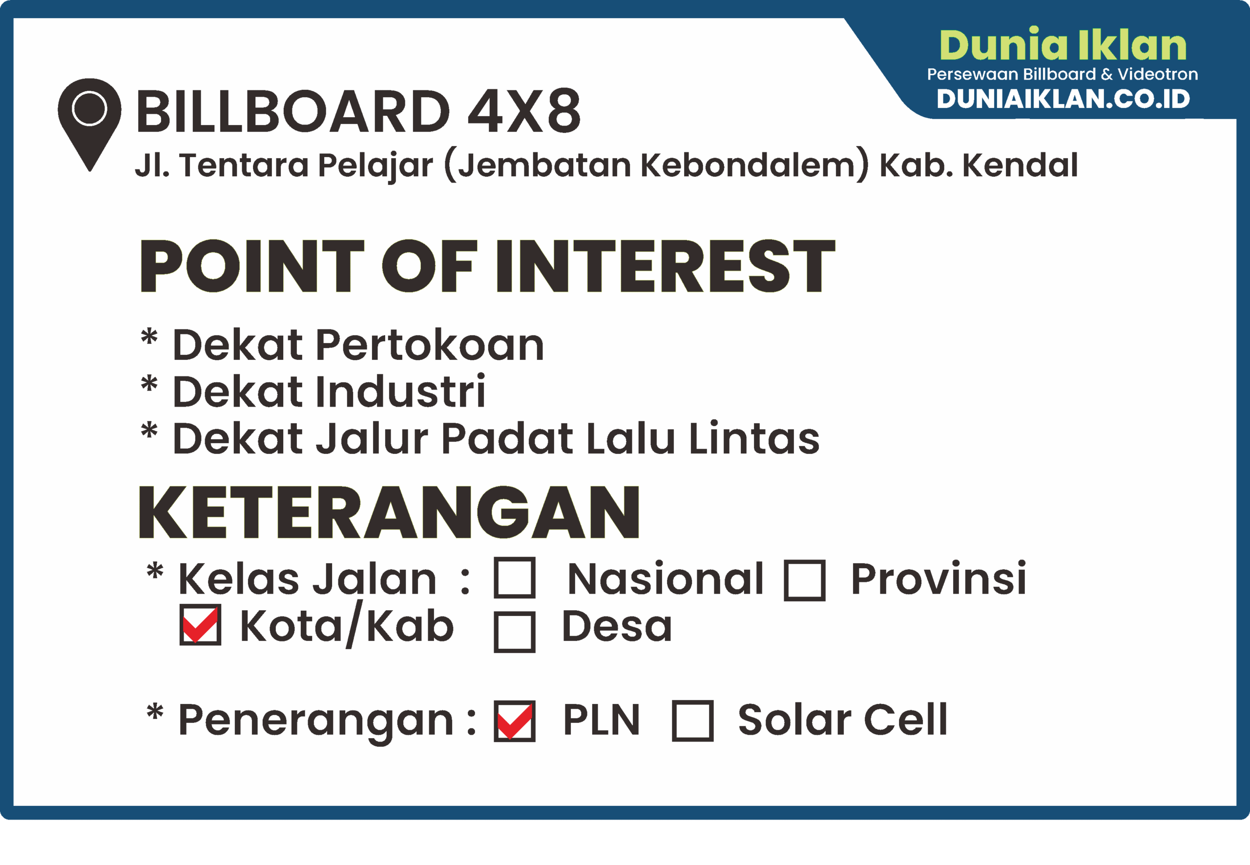 PT. Dunia Iklan Indonesia Jakarta menjadikan partner terbaik anda dalam menemukan kemudahan beriklan di ruang terbuka publik. Kami mempersembahkan ribuan titik-titik media iklan terbaik luar ruang berupa BALIHO, BILLBOARD ataupun VIDEOTRON di seluruh wilayah Indonesia dengan memberikan pilihan yang luas dan mudah diakses sesuai dengan target kebutuhan anda seperti titikĀ Billboard Ukuran 4 x 8 M Horizontal Jl. Tentara Pelajar (Jembatan Kebondalem) Kab. Kendal – Jawa Tengah ini.