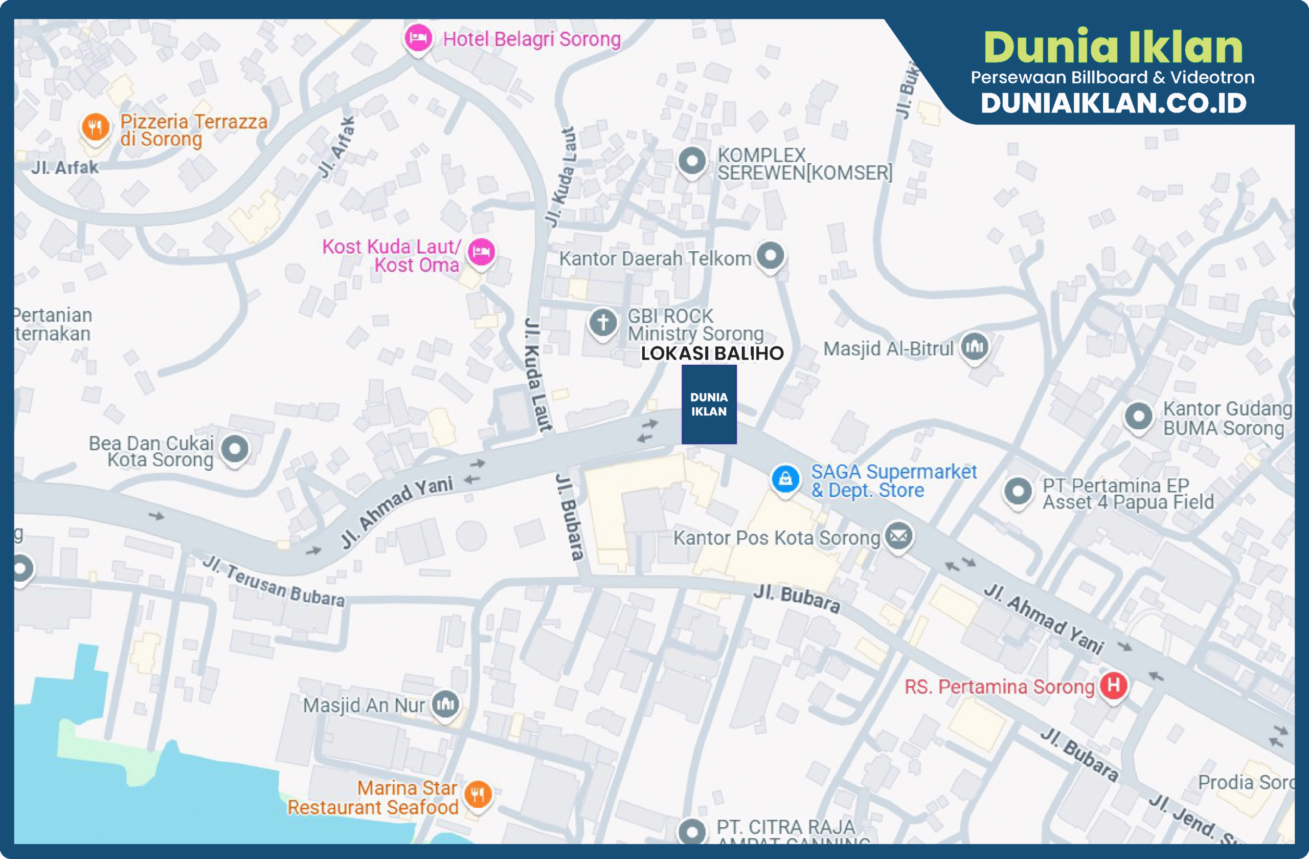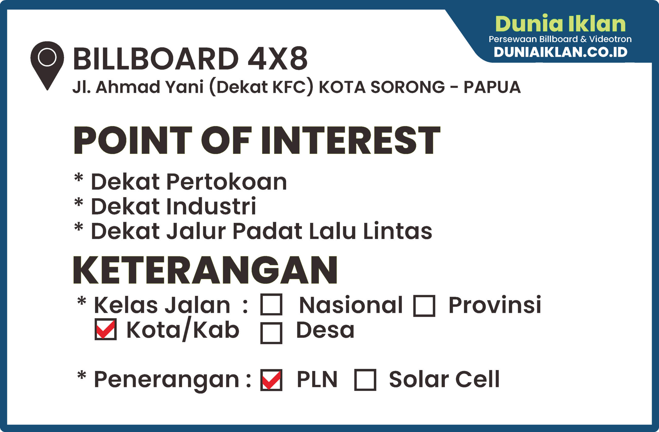 PT. Dunia Iklan Indonesia Jakarta menjadikan partner terbaik anda dalam menemukan kemudahan beriklan di ruang terbuka publik. Kami mempersembahkan ribuan titik-titik media iklan terbaik luar ruang berupa BALIHO, BILLBOARD ataupun VIDEOTRON di seluruh wilayah Indonesia dengan memberikan pilihan yang luas dan mudah diakses sesuai dengan target kebutuhan anda seperti titikĀ Billboard Ukuran 4 x 8 M Vertikal Jl. Ahmad Yani Kota Sorong – Papua ini.