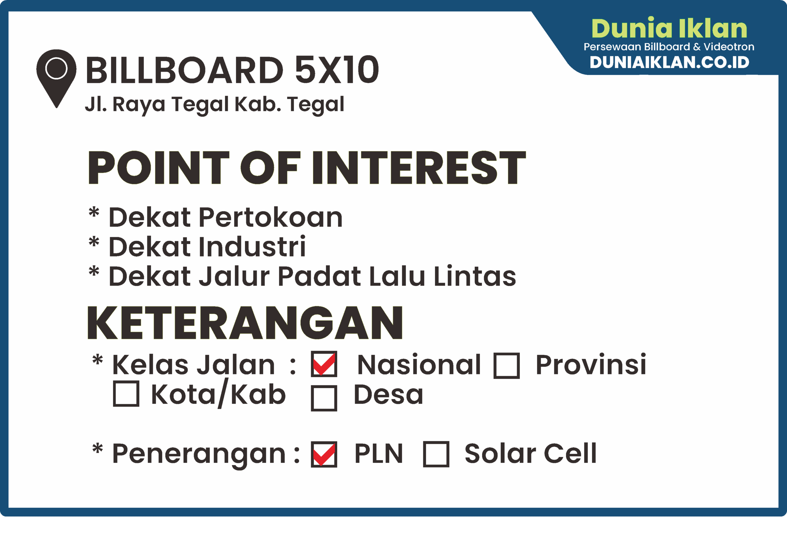 PT. Dunia Iklan Indonesia Jakarta menjadikan partner terbaik anda dalam menemukan kemudahan beriklan di ruang terbuka publik. Kami mempersembahkan ribuan titik-titik media iklan terbaik luar ruang berupa BALIHO, BILLBOARD ataupun VIDEOTRON di seluruh wilayah Indonesia dengan memberikan pilihan yang luas dan mudah diakses sesuai dengan target kebutuhan anda seperti titikĀ Billboard Ukuran 4 x 8 M Vertikal Jl. Raya Tegal Kab. Tegal – Jawa Tengah ini.