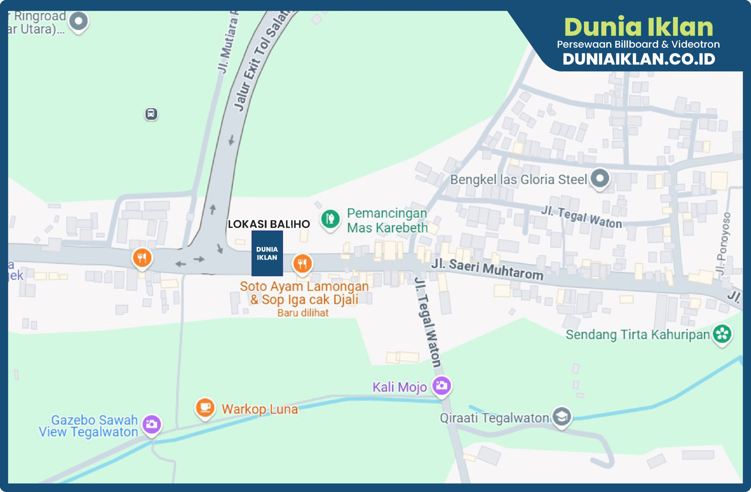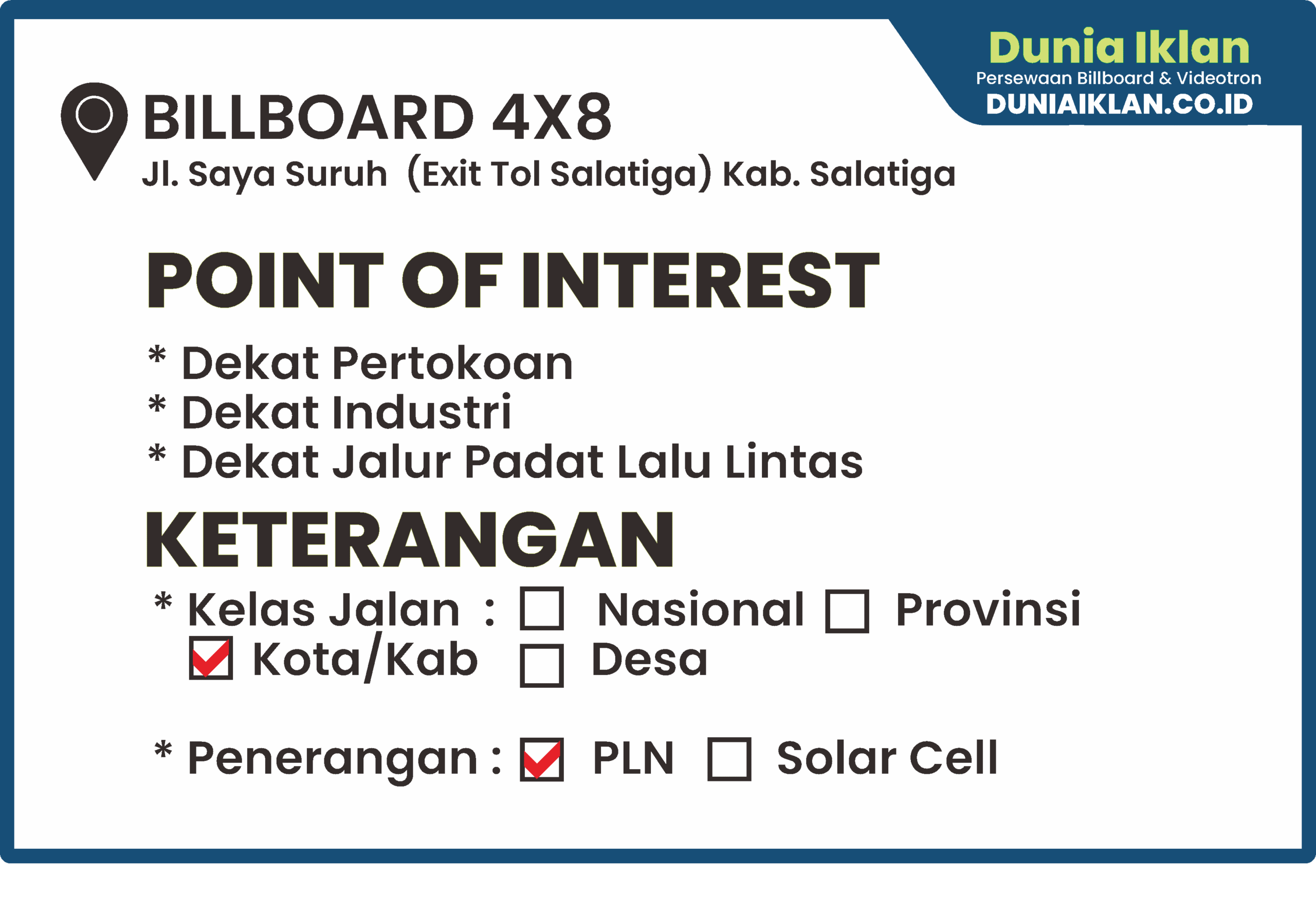 PT. Dunia Iklan Indonesia Jakarta menjadikan partner terbaik anda dalam menemukan kemudahan beriklan di ruang terbuka publik. Kami mempersembahkan ribuan titik-titik media iklan terbaik luar ruang berupa BALIHO, BILLBOARD ataupun VIDEOTRON di seluruh wilayah Indonesia dengan memberikan pilihan yang luas dan mudah diakses sesuai dengan target kebutuhan anda seperti titikĀ Billboard Ukuran 4 x 8 M Vertikal Jl. Raya Suruh (Exit Tol Salatiga) Kota Salatiga – Jawa Tengah ini.