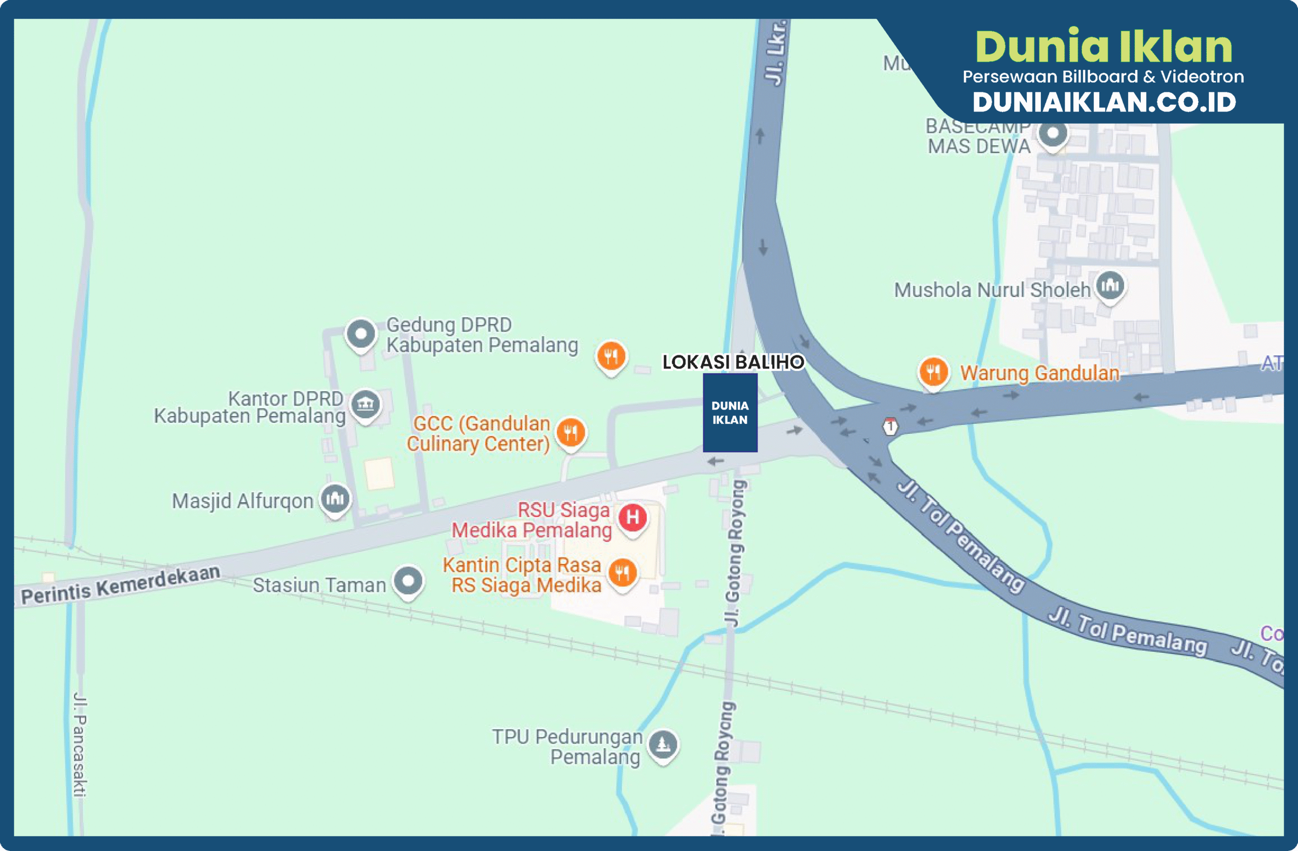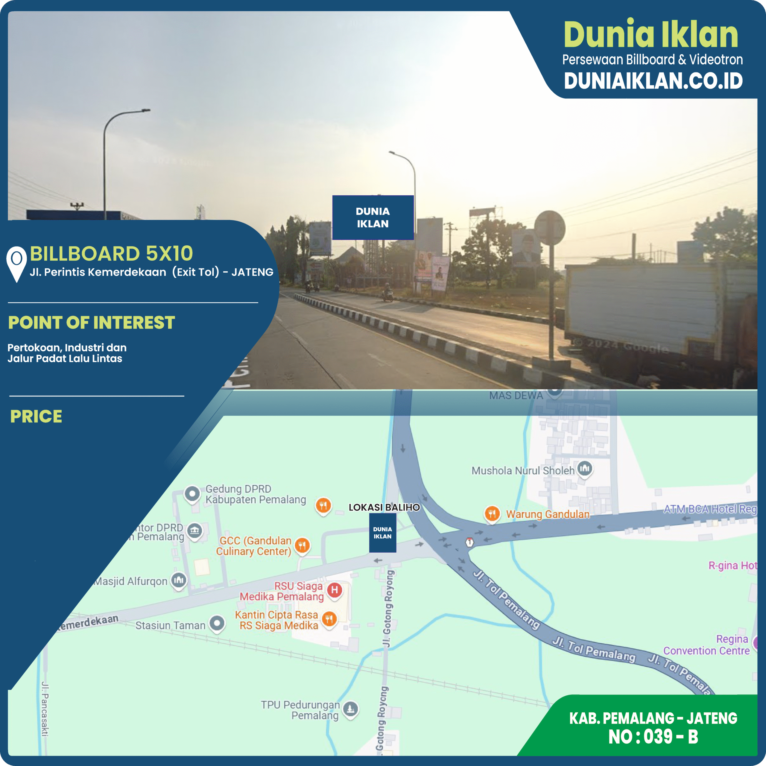 PT. Dunia Iklan Indonesia Jakarta menjadikan partner terbaik anda dalam menemukan kemudahan beriklan di ruang terbuka publik. Kami mempersembahkan ribuan titik-titik media iklan terbaik luar ruang berupa BALIHO, BILLBOARD ataupun VIDEOTRON di seluruh wilayah Indonesia dengan memberikan pilihan yang luas dan mudah diakses sesuai dengan target kebutuhan anda seperti titikĀ Billboard Ukuran 5 x 10 M Horizontal Jl. Perintis Kemerdekaan (Exit Tol) Kab. Pemalang – Jawa Tengah ini.
