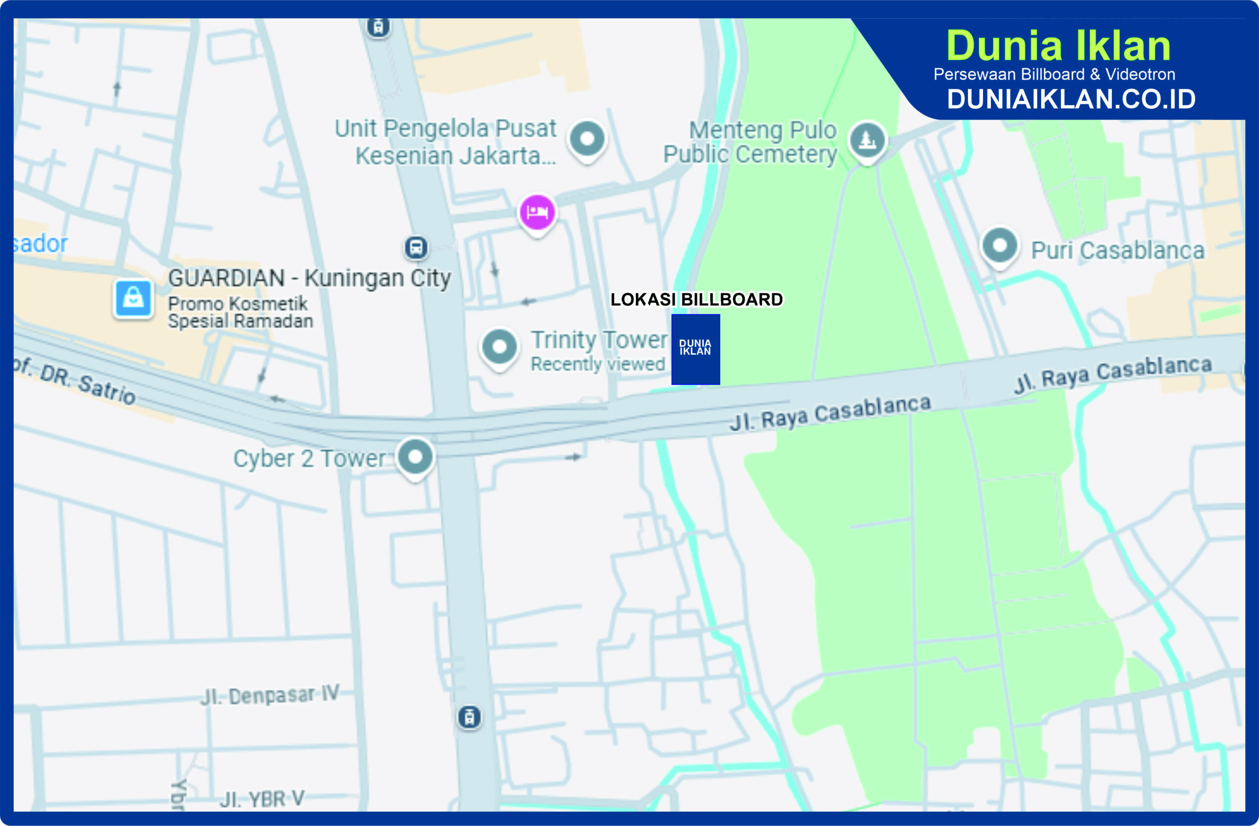 PT. Dunia Iklan Indonesia Jakarta menjadikan partner terbaik anda dalam menemukan kemudahan beriklan di ruang terbuka publik. Kami mempersembahkan ribuan titik-titik media iklan terbaik luar ruang berupa BALIHO, BILLBOARD ataupun VIDEOTRON di seluruh wilayah Indonesia dengan memberikan pilihan yang luas dan mudah diakses sesuai dengan target kebutuhan anda seperti titikĀ Billboard Ukuran 5 x 10 Meter Vertikal Jl. Raya Casablanca Jakarta Pusat ini.