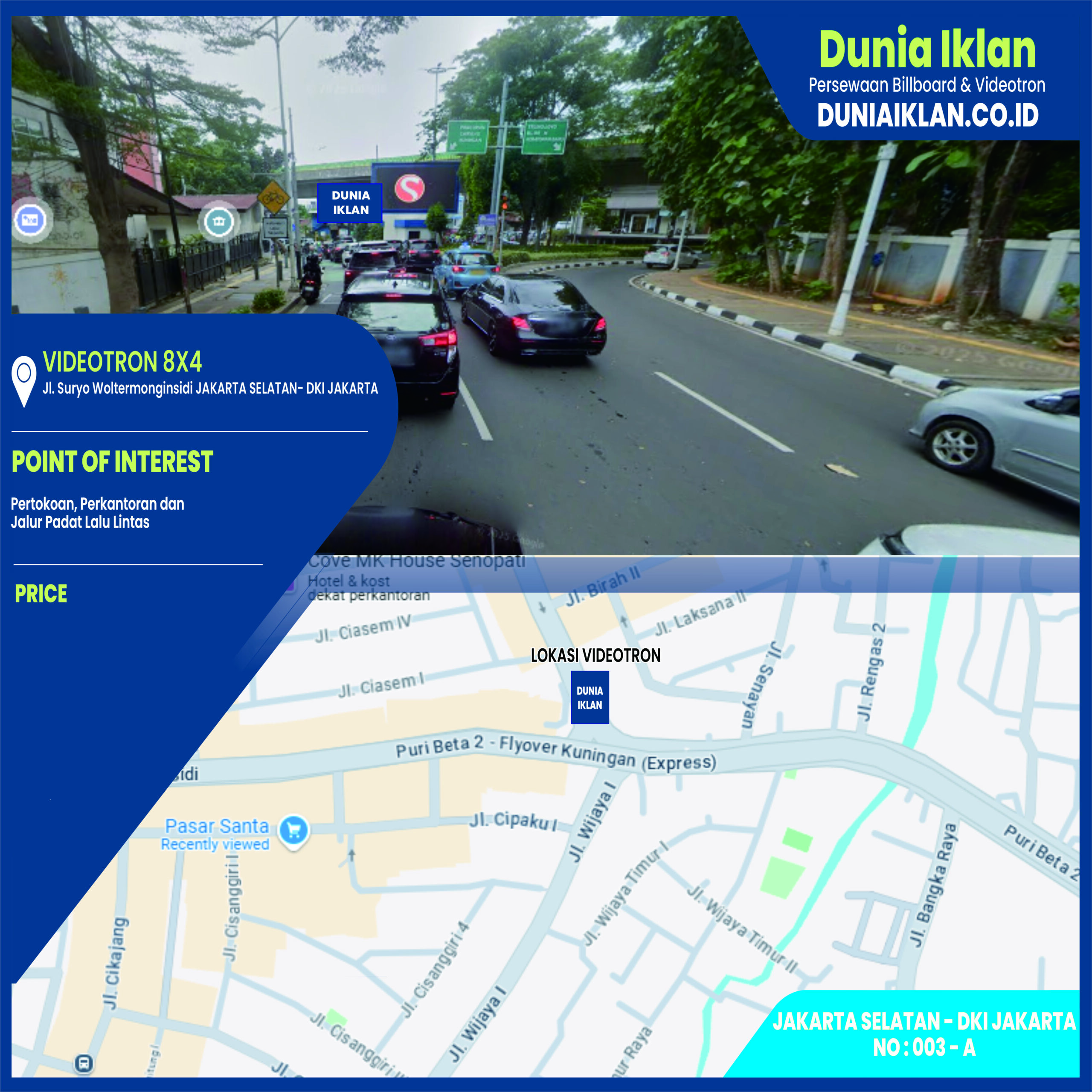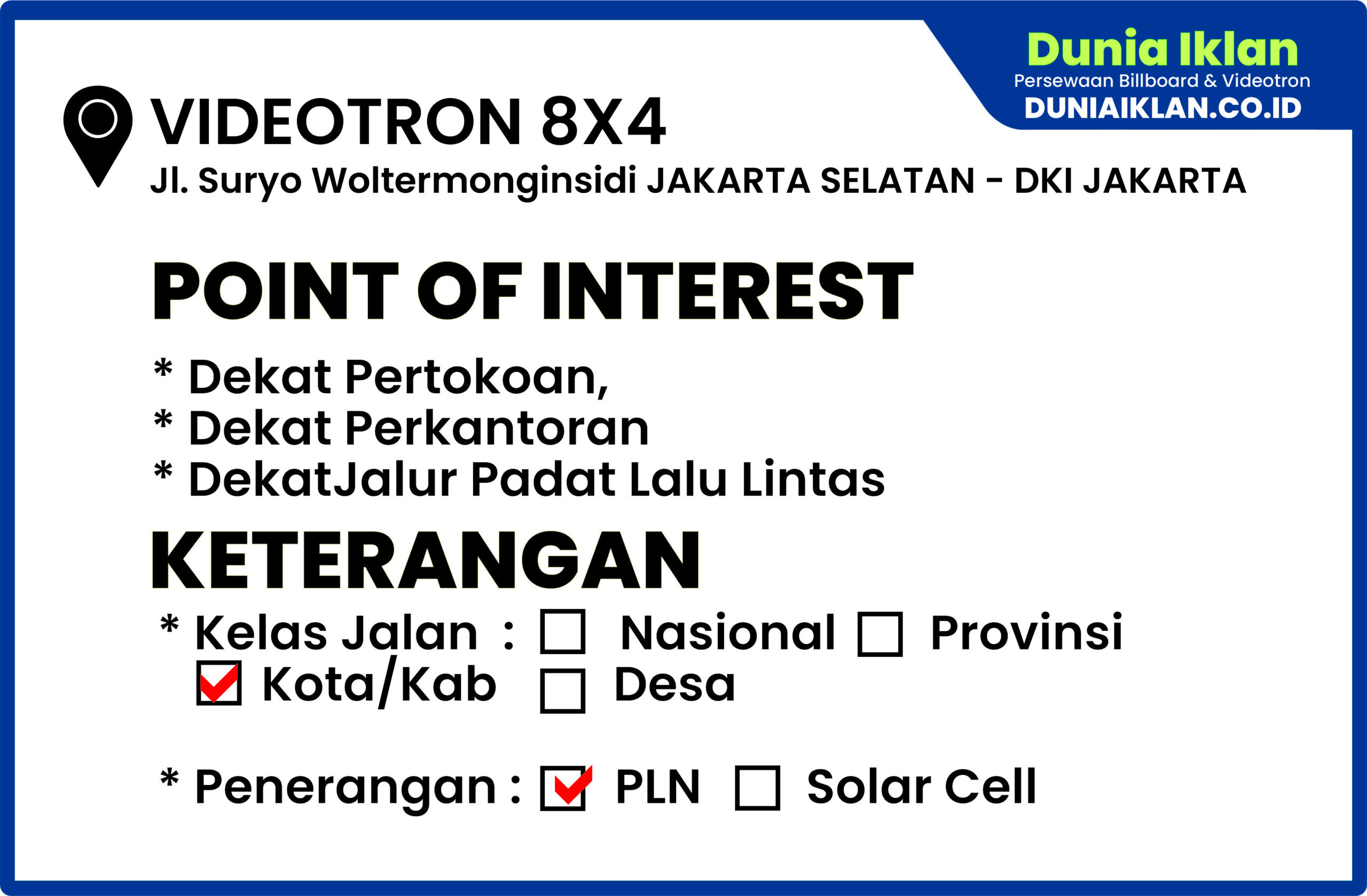 PT. Dunia Iklan Indonesia Jakarta menjadikan partner terbaik anda dalam menemukan kemudahan beriklan di ruang terbuka publik. Kami mempersembahkan ribuan titik-titik media iklan terbaik luar ruang berupa BALIHO, BILLBOARD ataupun VIDEOTRON di seluruh wilayah Indonesia dengan memberikan pilihan yang luas dan mudah diakses sesuai dengan target kebutuhan anda seperti titik Videotron Outdoor ukuran 8 x 4 Meter Horisontal Jl. Suryo Woltermonginsidi Jakarta Selatan ini.